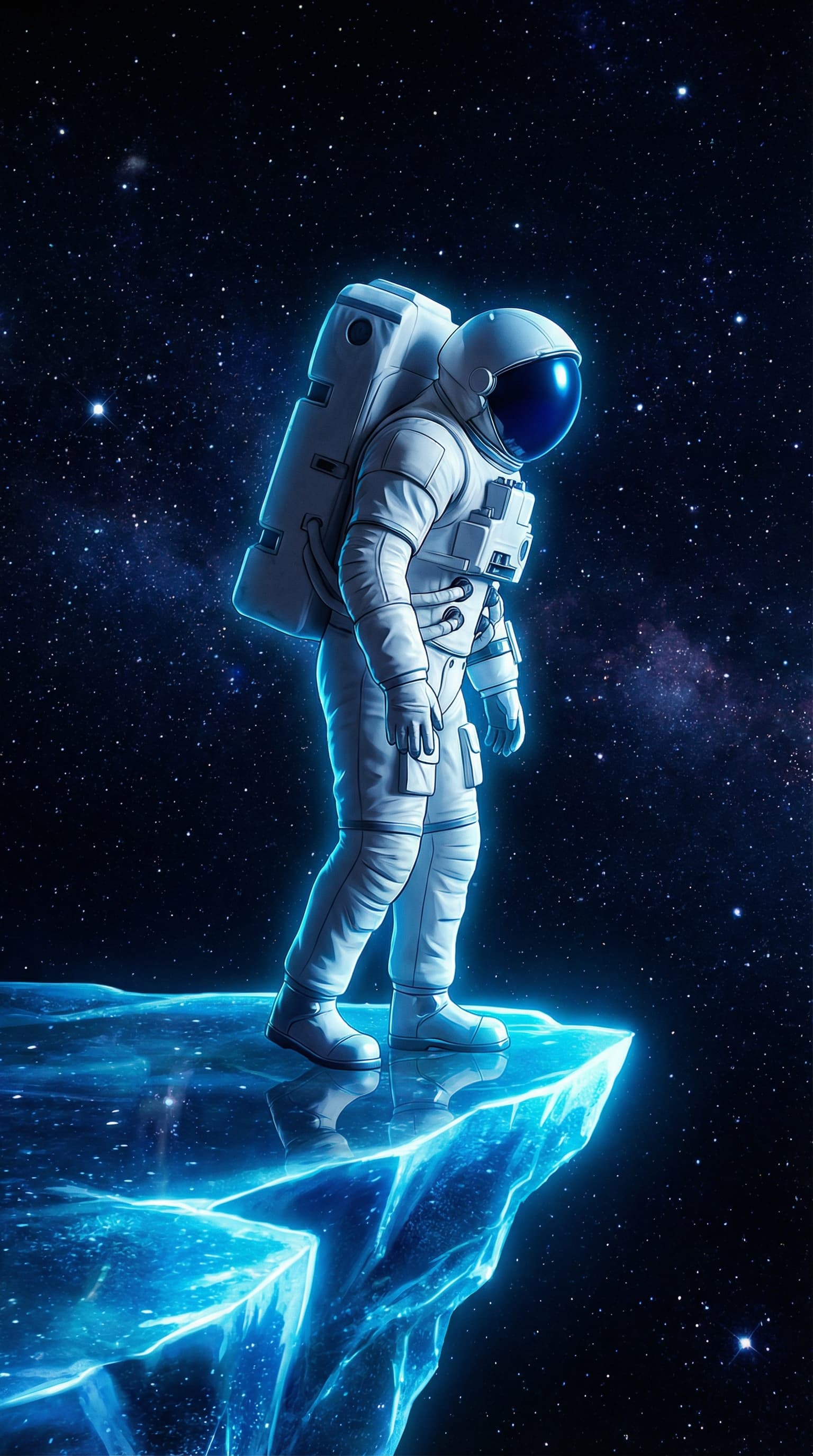 A lone astronaut stands on the edge of a luminous, jagged crystal formation against a backdrop of deep space. The sce...