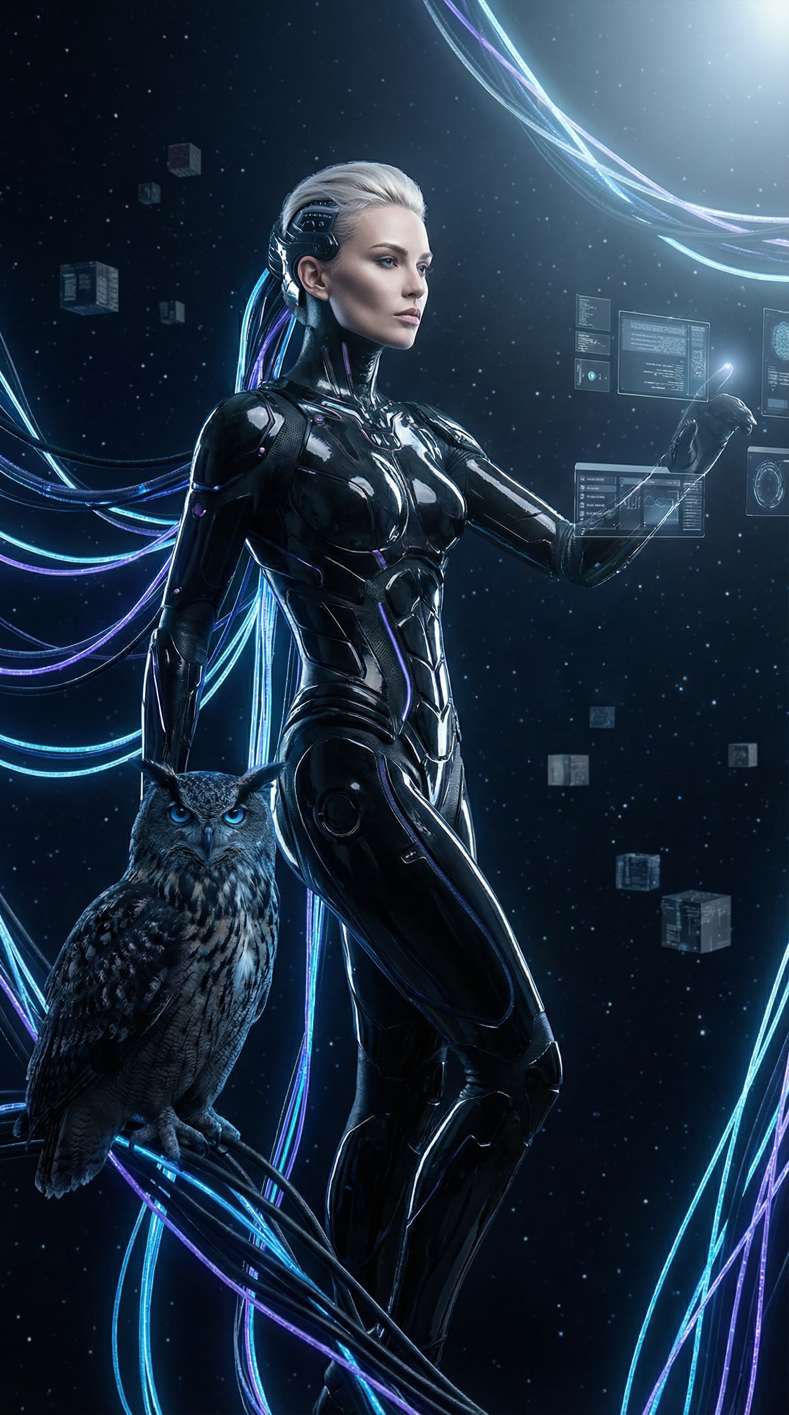 A futuristic figure in a sleek black suit stands amidst glowing data streams and holographic displays. An owl perches...