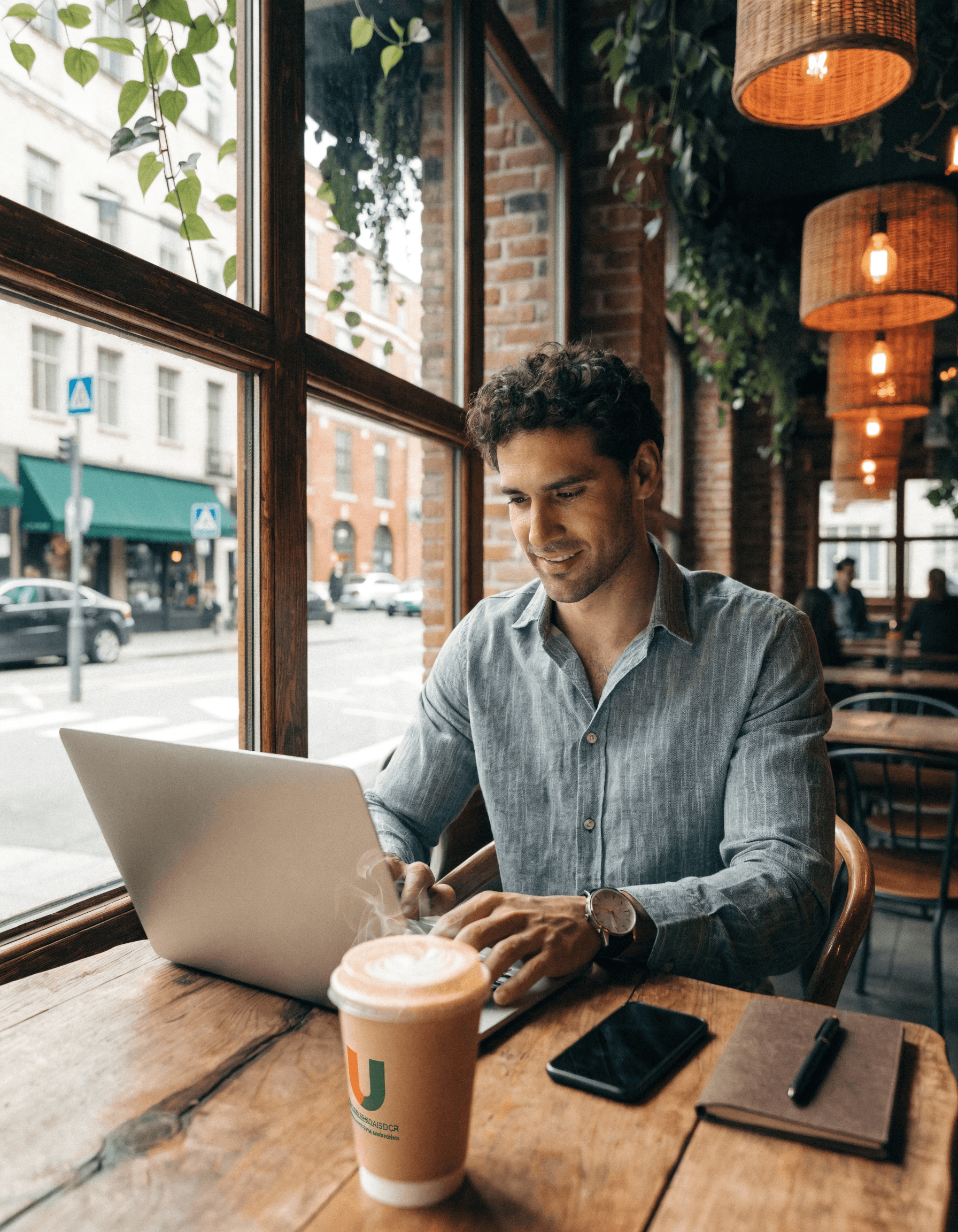 A young man works on his laptop in a sun-drenched cafe, a steaming latte at his side. The image captures a mood of qu...