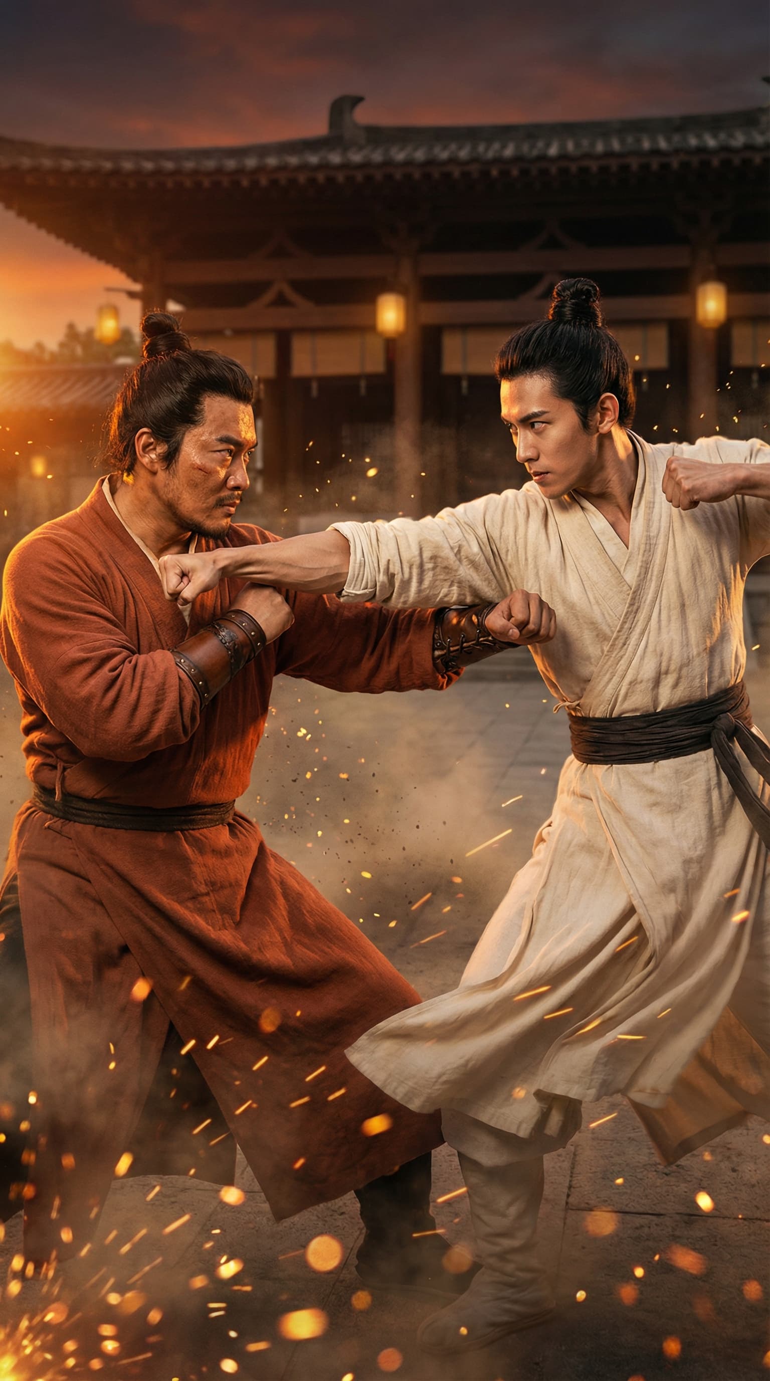Two martial artists, clad in traditional garb, face off in a tense showdown amid a flurry of sparks. Set against a ba...