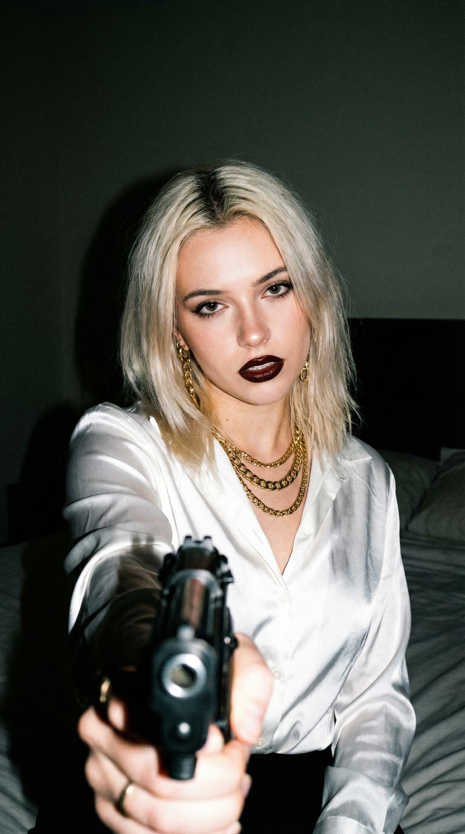 A woman in a silk shirt and gold jewelry stares intensely at the viewer, holding a gun pointed forward. The low-lit b...
