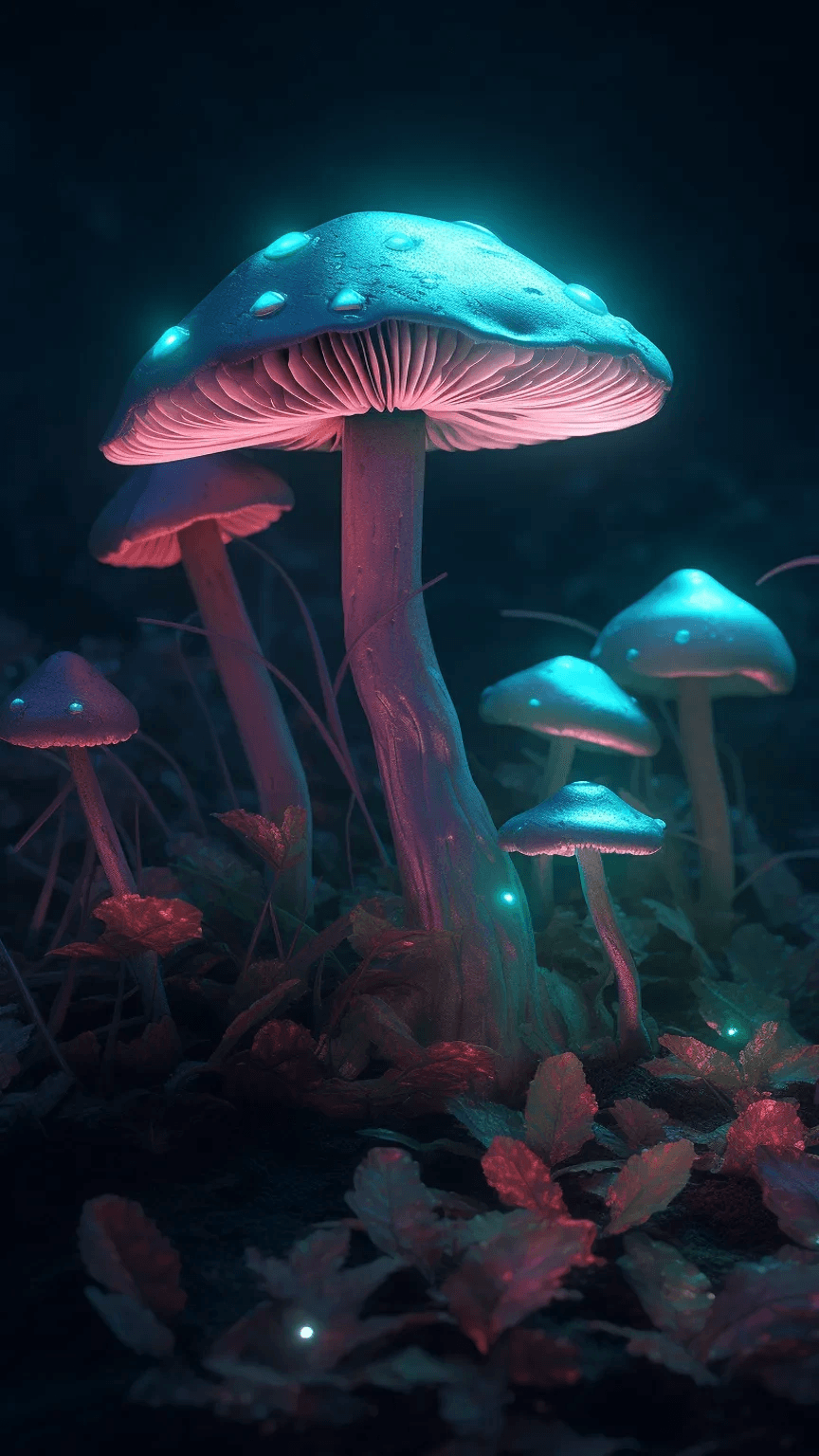Luminous backlit glowing forest mushroom, neon lights around the mushroom, faded...