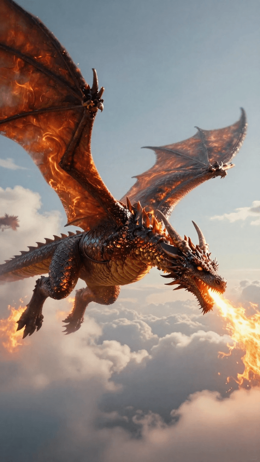 A fantasy dragon soaring through the clouds, breathing fire, scales shimmering i...