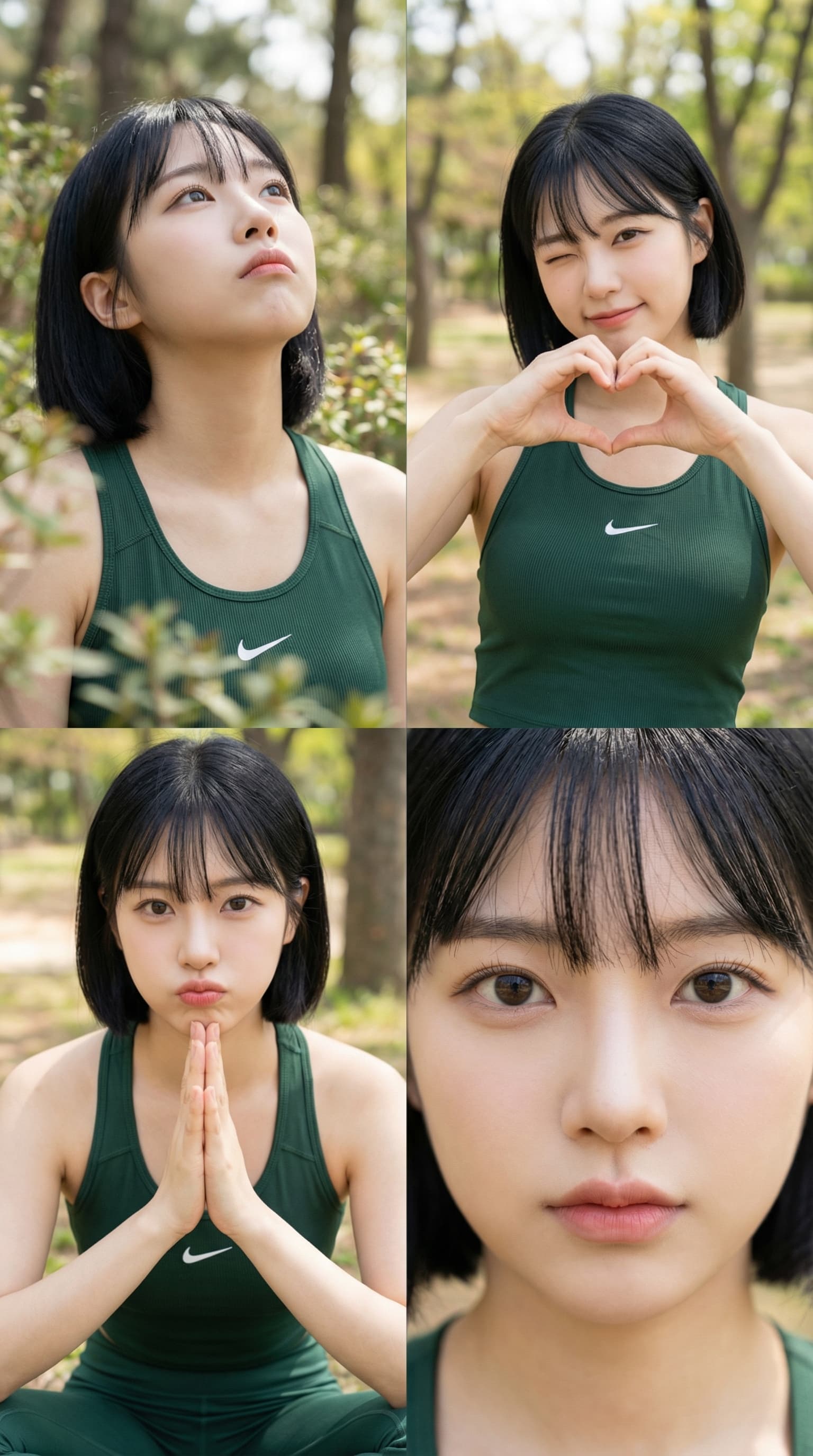 This portrait collage captures a young woman in a natural setting, presenting a range of expressive poses and a conte...