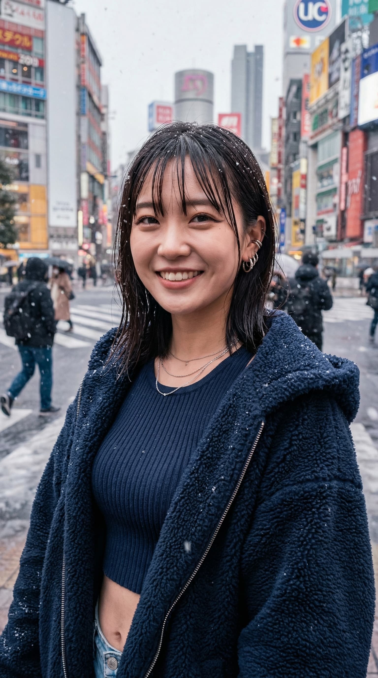 A young woman smiles at the viewer amidst a flurry of snow in a bustling Tokyo intersection. The vibrant city backdro...