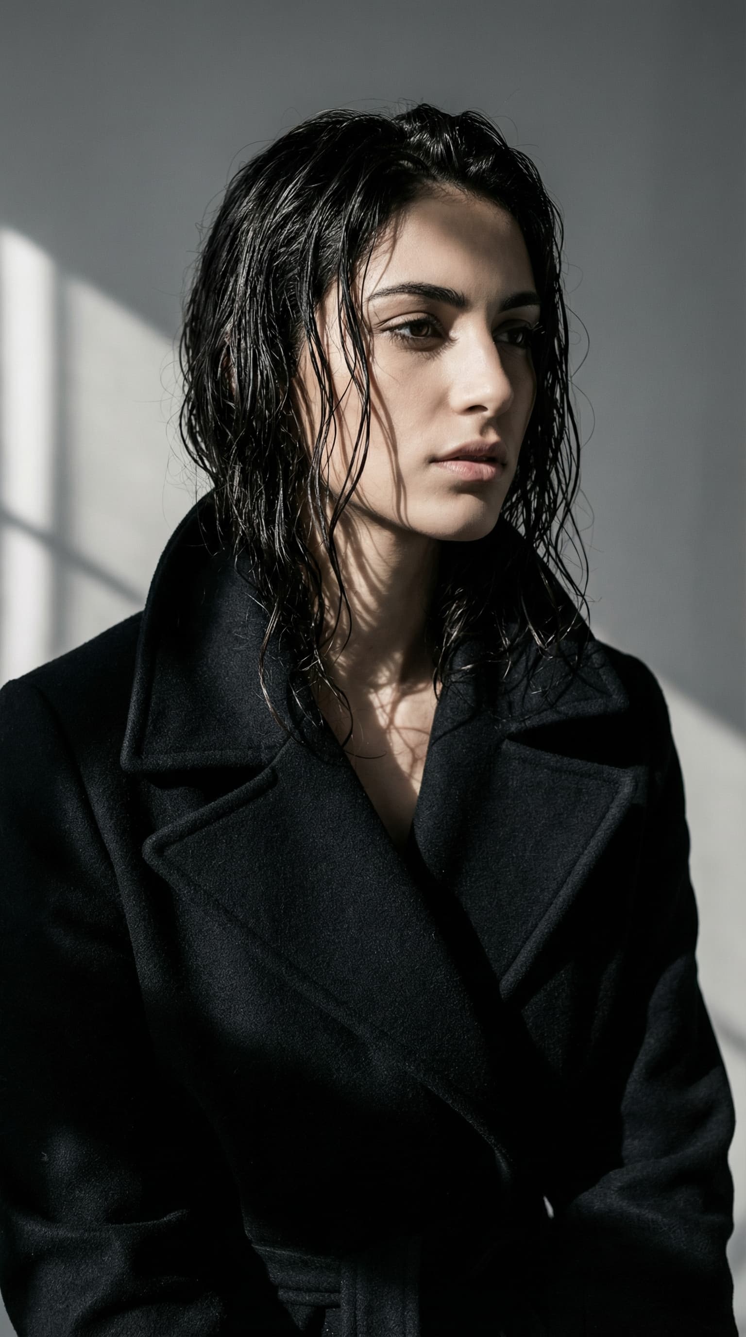 A young woman in a tailored coat stands in a stark, light-filled space, her expression contemplative. The image is re...