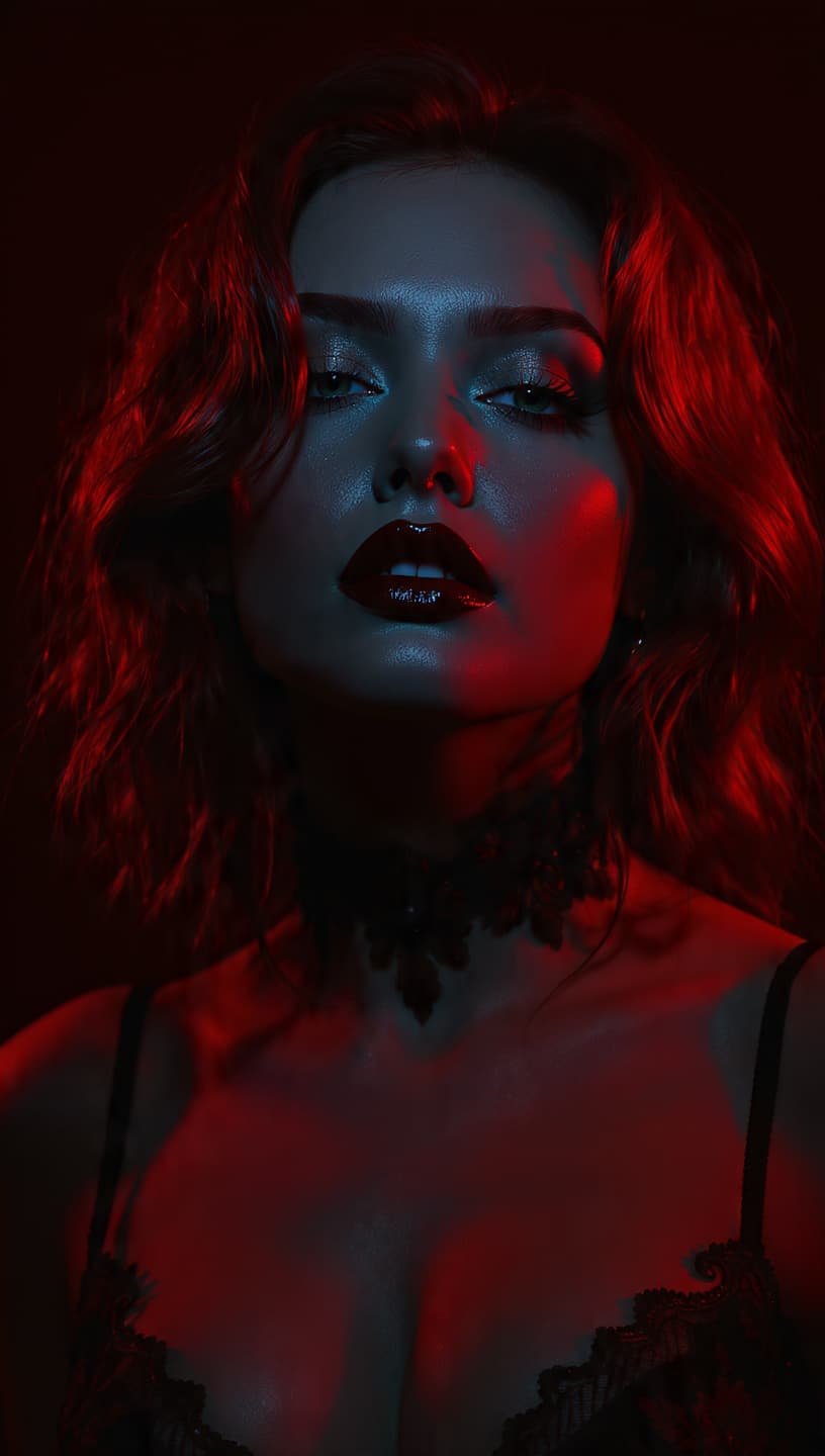 A woman in a lace dress stands confidently in a shadowy city alley. Rendered in a stark, graphic style reminiscent of...