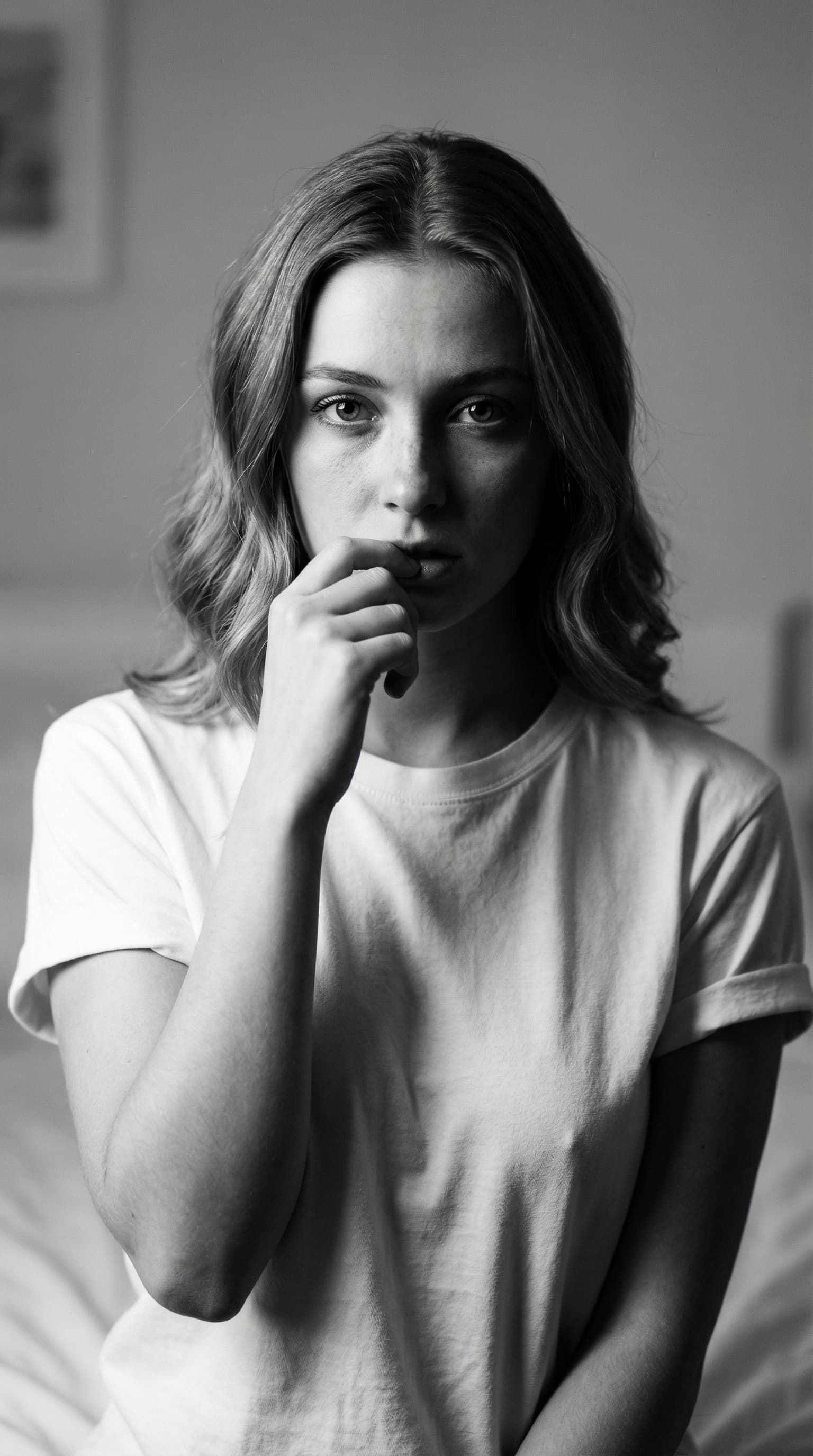 This black and white portrait captures a young woman in a pensive mood, her hand gently touching her lips. The intima...