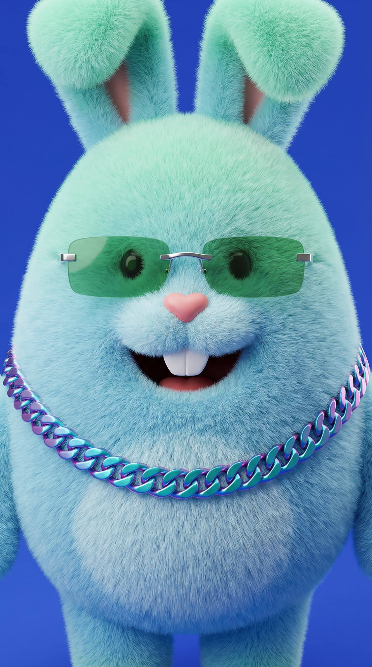 A vibrant, fluffy turquoise bunny sports tinted sunglasses and a chunky chain necklace against a solid blue backdrop....