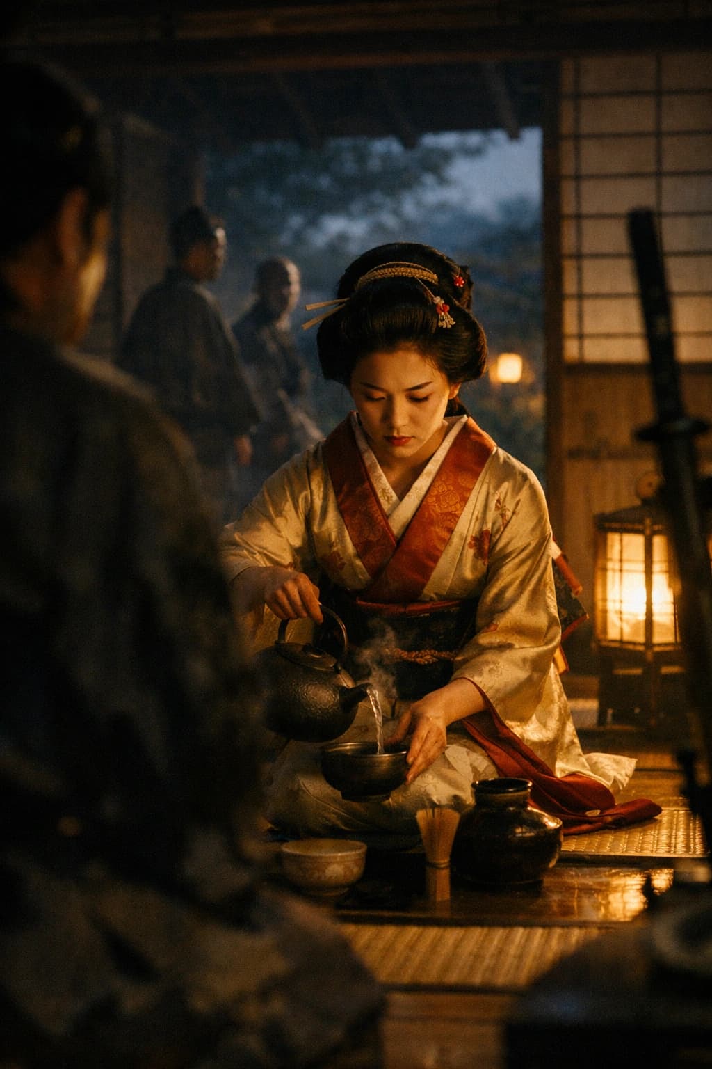 In this softly lit scene, a geisha pours tea in a traditional Japanese interior as shadowy figures watch from the bac...