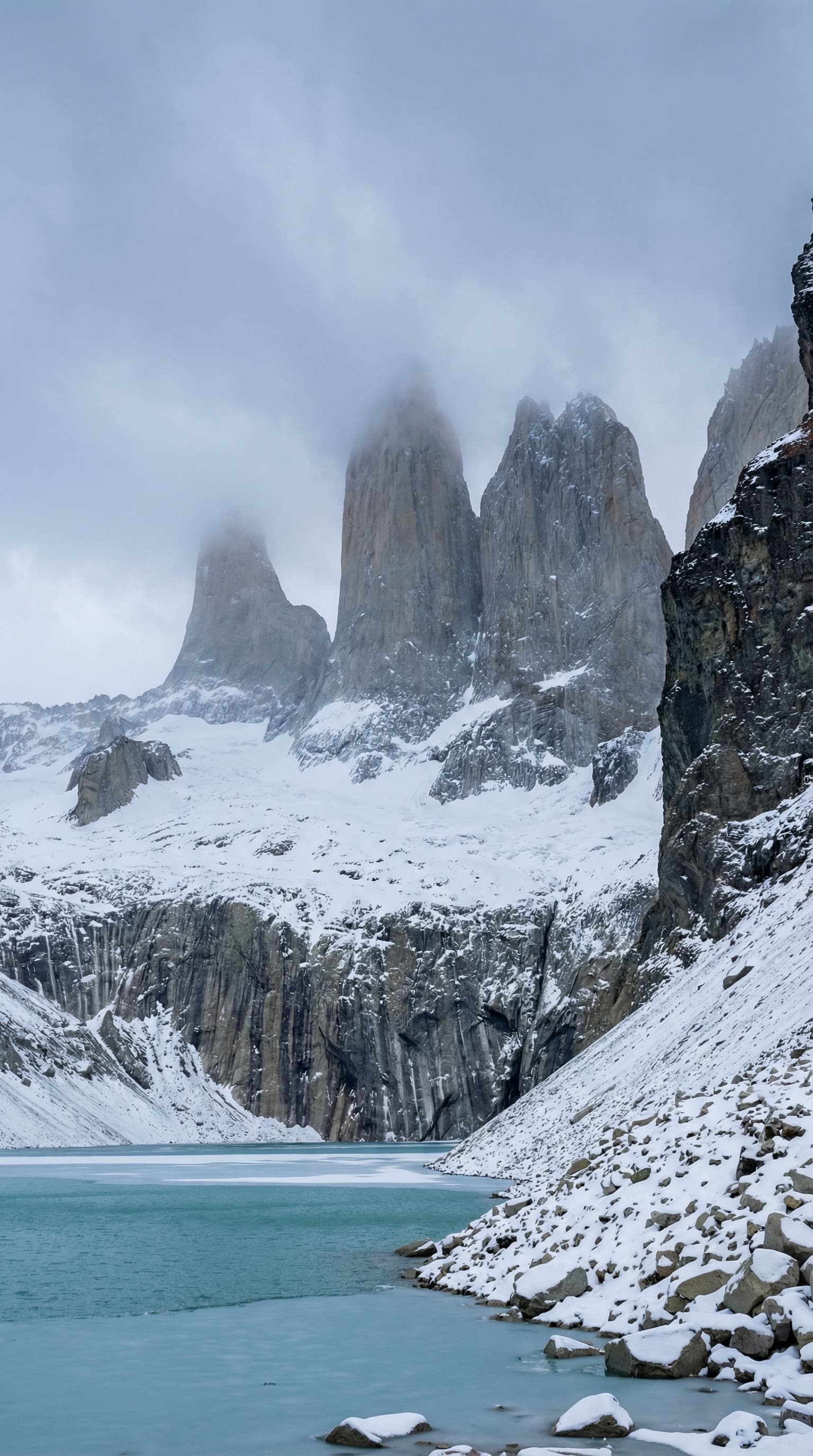 Jagged peaks pierce the sky, their summits shrouded in mist, in this stark mountain landscape. A turquoise lake, part...