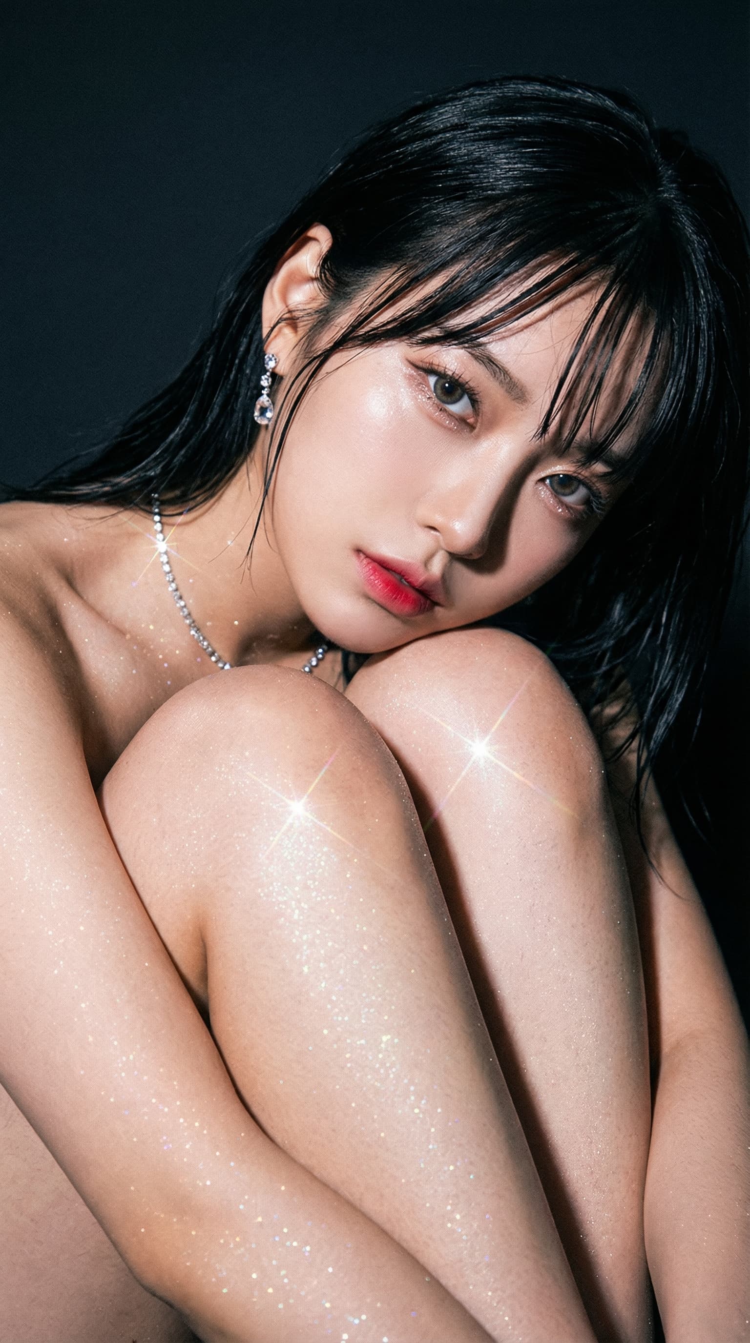 This intimate portrait captures a young woman against a dark backdrop, knees drawn close in a contemplative pose. The...