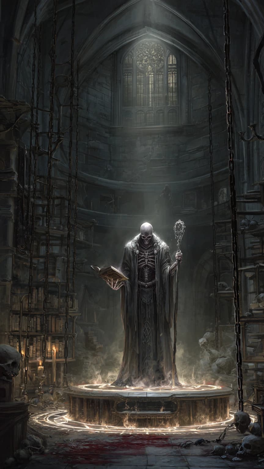 A dark, gothic chamber with a centered necromancer, ancient and corrupted by dar...