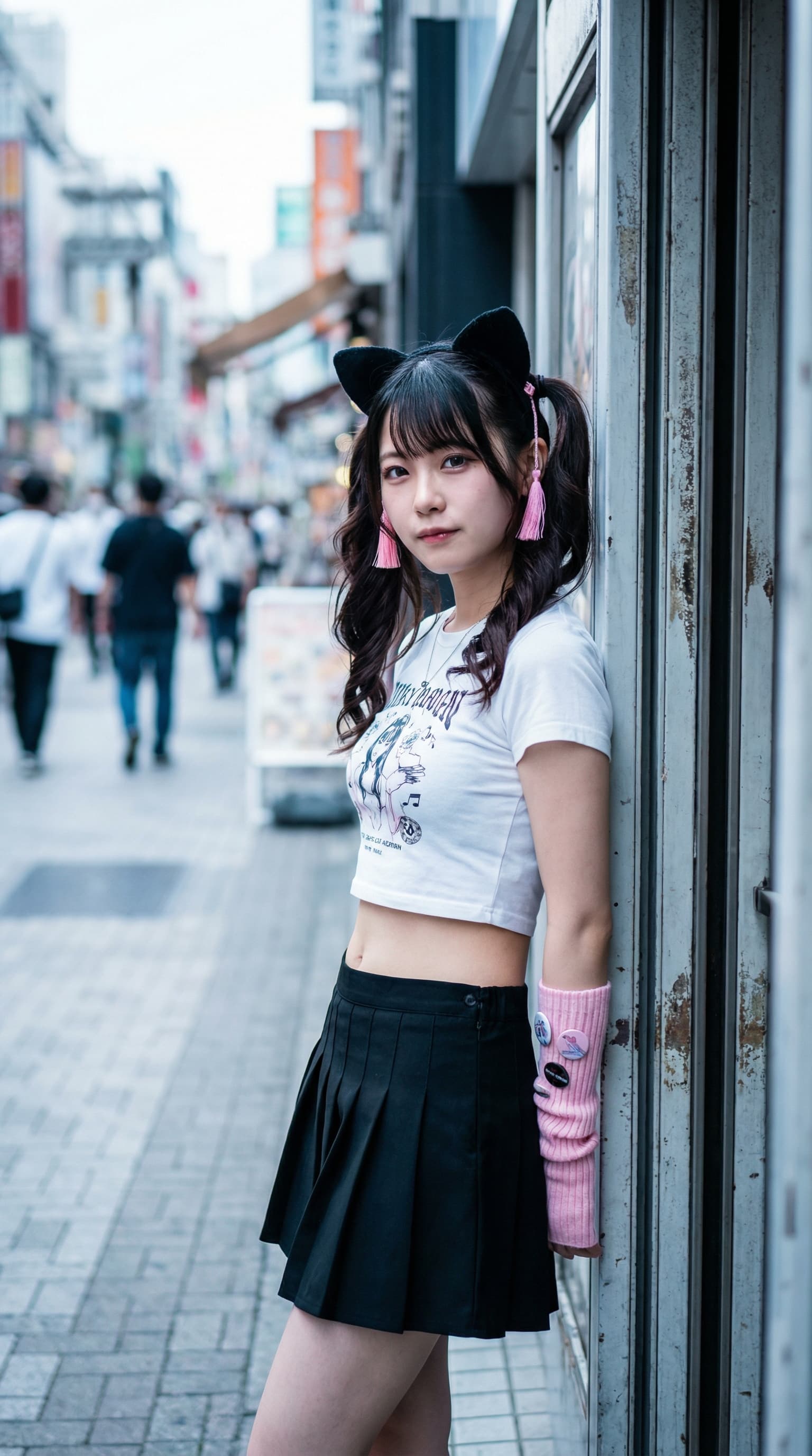A young woman with cat ears and pink tassels stands leaning against a distressed metal storefront. The urban scene is...