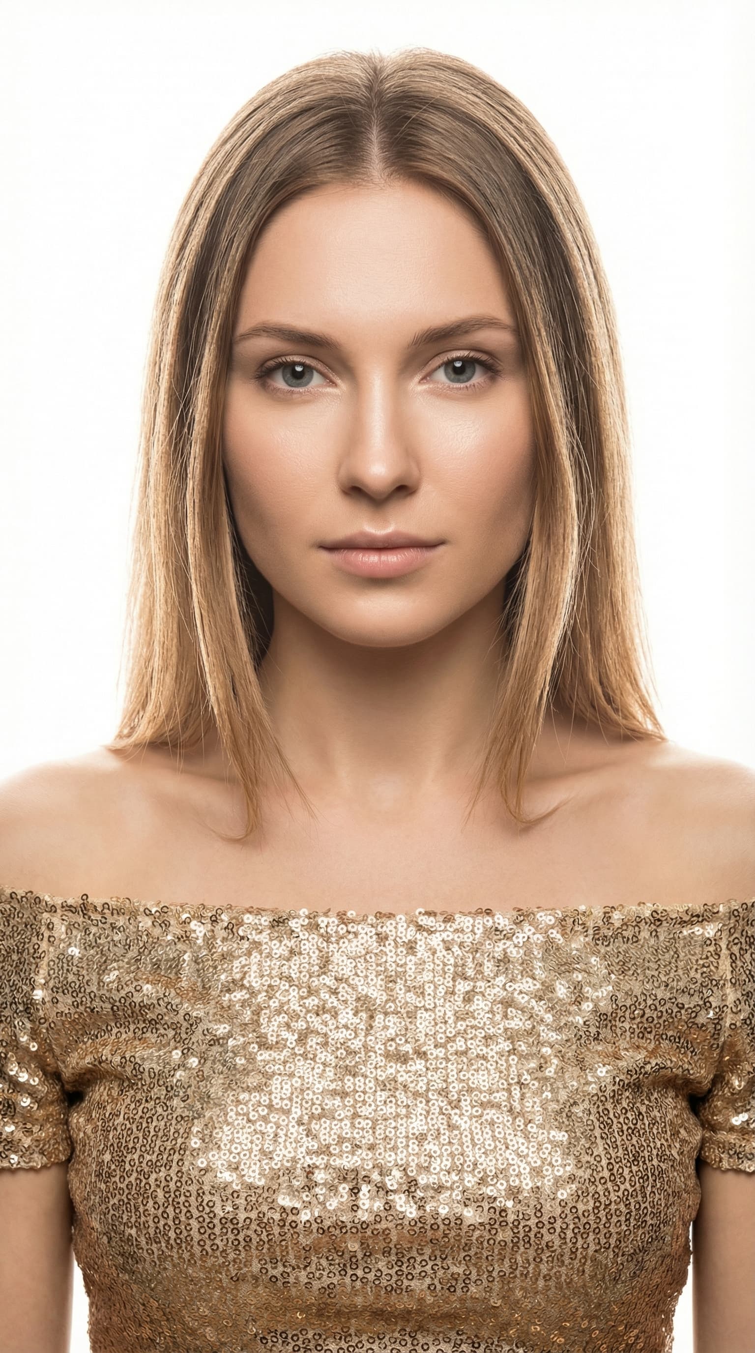 A young woman gazes directly forward in this portrait. She wears a sparkling gold dress against a stark white backgro...