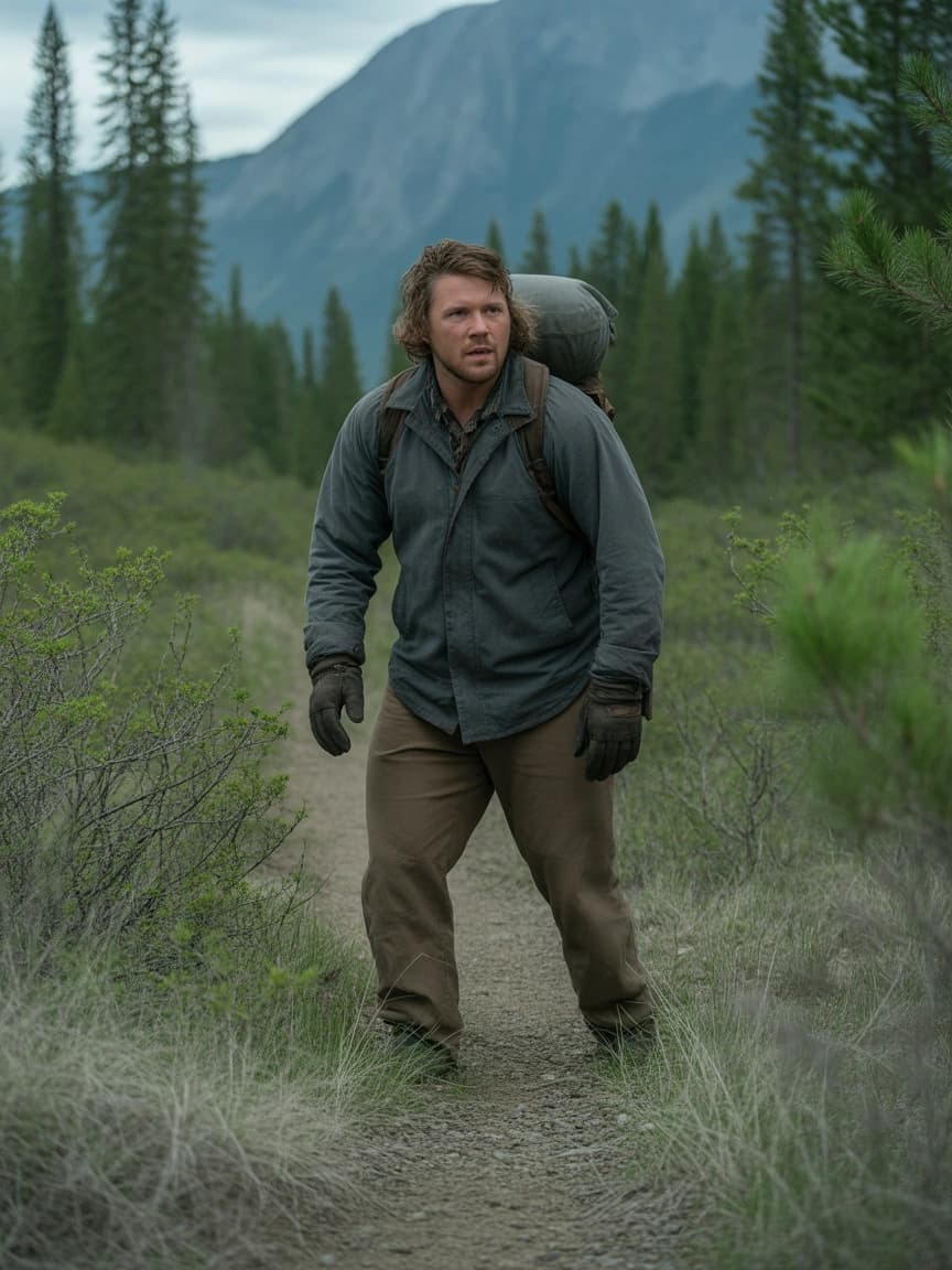 A lone hiker pauses on a path winding through a forest, a mountain looming in the distance. The muted palette and war...