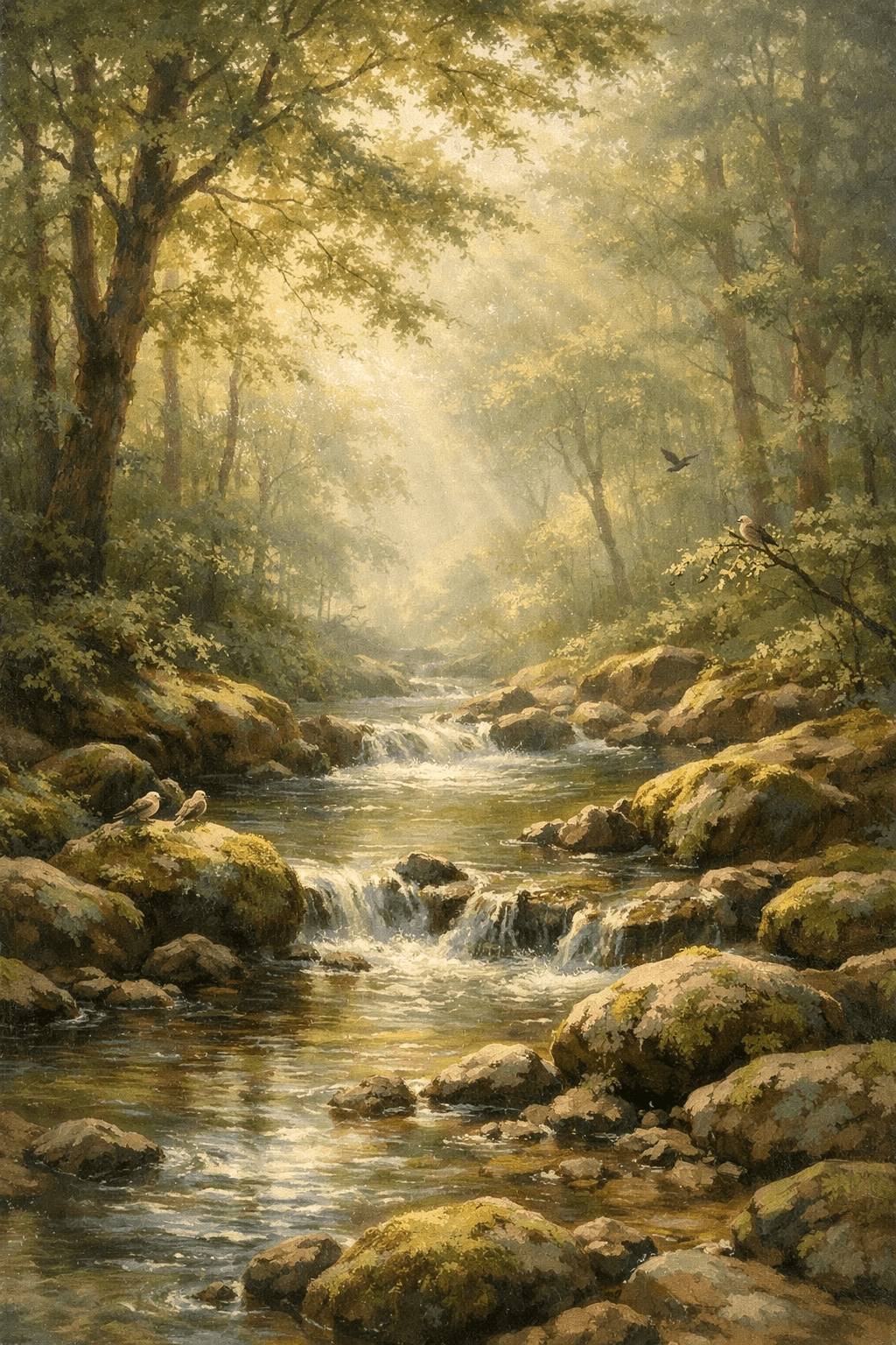 A serene forest scene with sunlight filtering through the leaves, a clear stream...