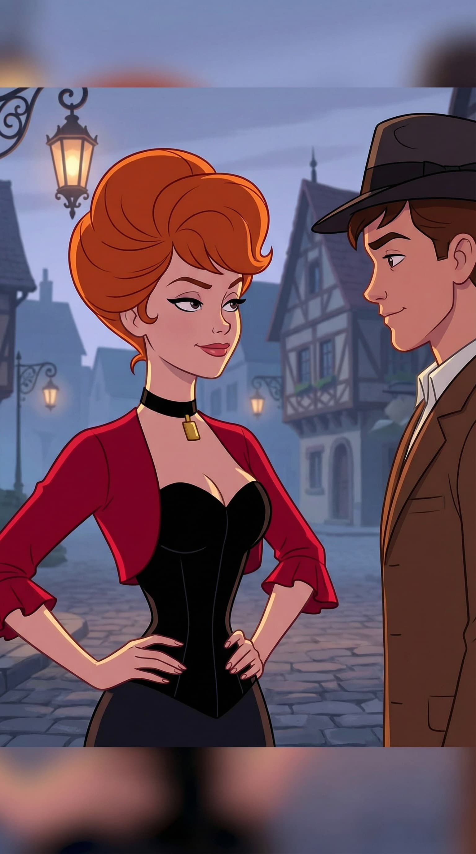 Rendered in a crisp, cartoon style, a confident redhead exchanges a knowing glance with a man in a fedora. Cobbleston...