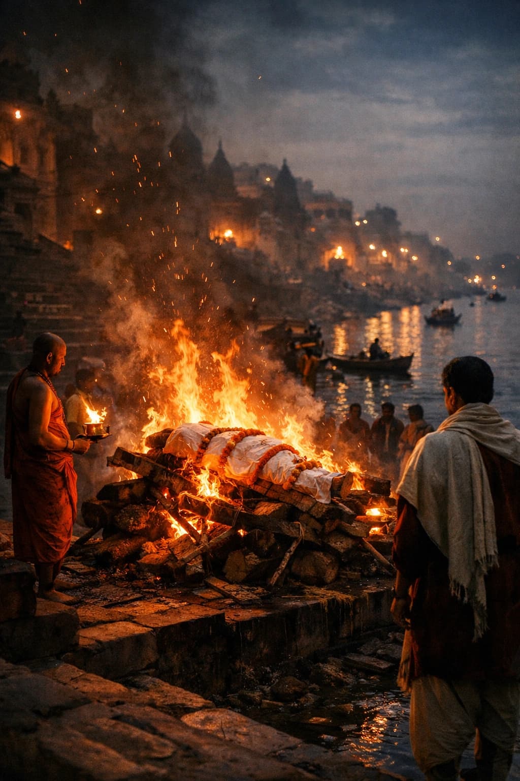 This image depicts a funeral pyre burning on the ghats of a holy river, likely the Ganges. Monks and mourners gather ...