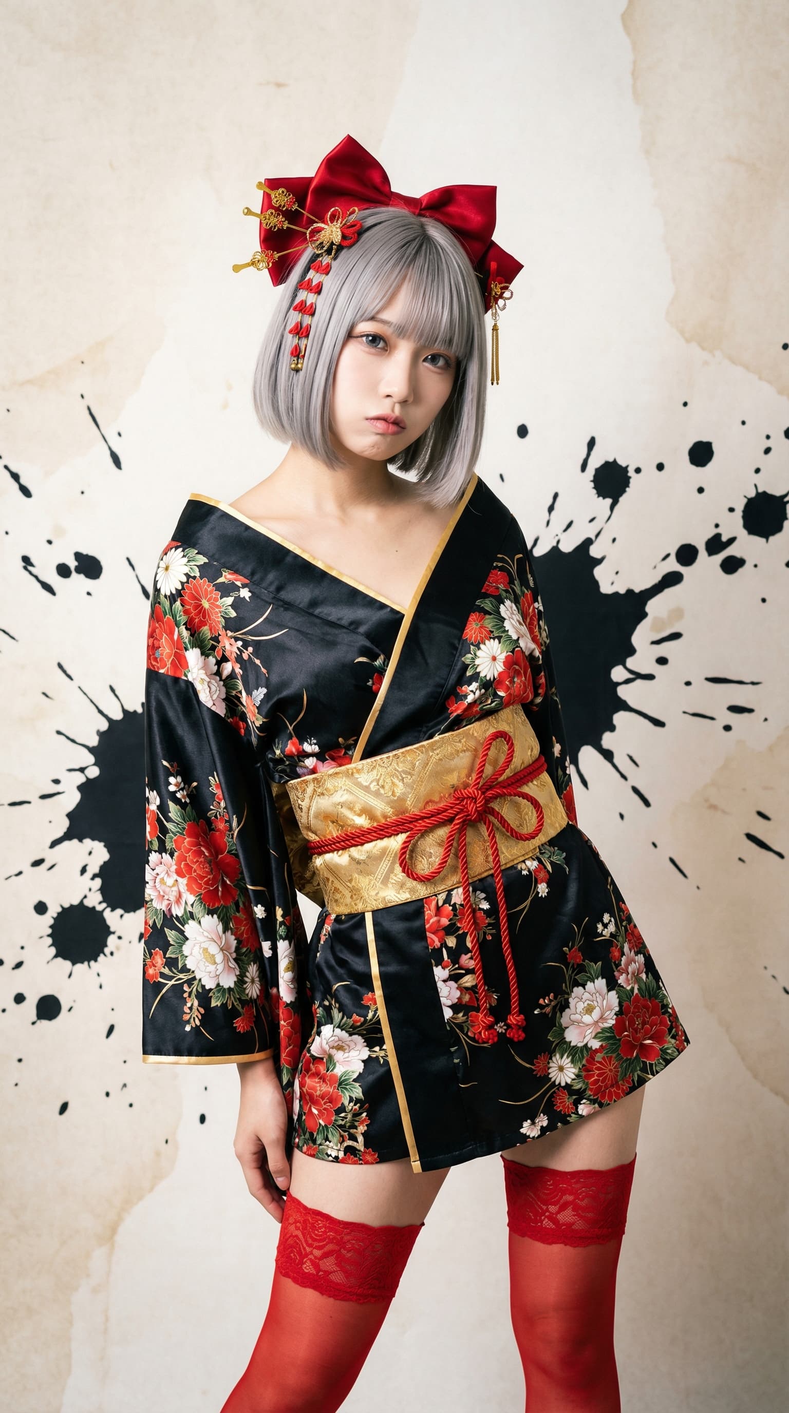 This stylized portrait features a young woman in a floral kimono and traditional hair ornaments, juxtaposing classic ...