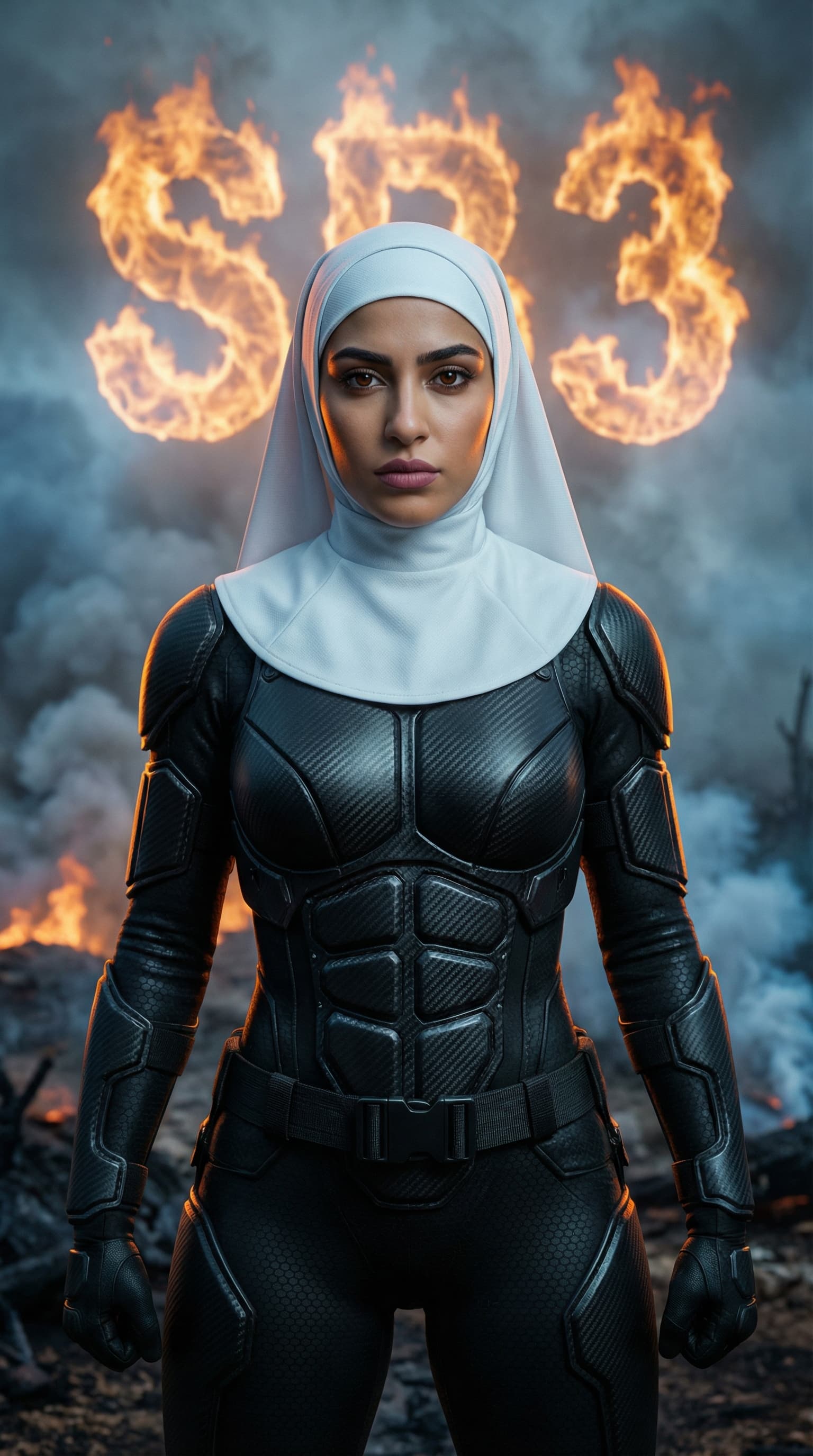 A stern figure in a nun's habit stands against a backdrop of fire and smoke. Clad in tactical armor, she embodies a b...