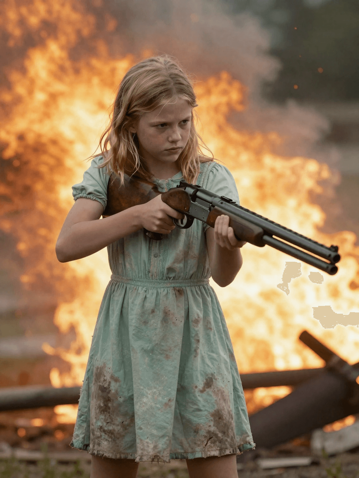 Cinematic scene, A young blonde girl in a dirty light green dress, holding a big...