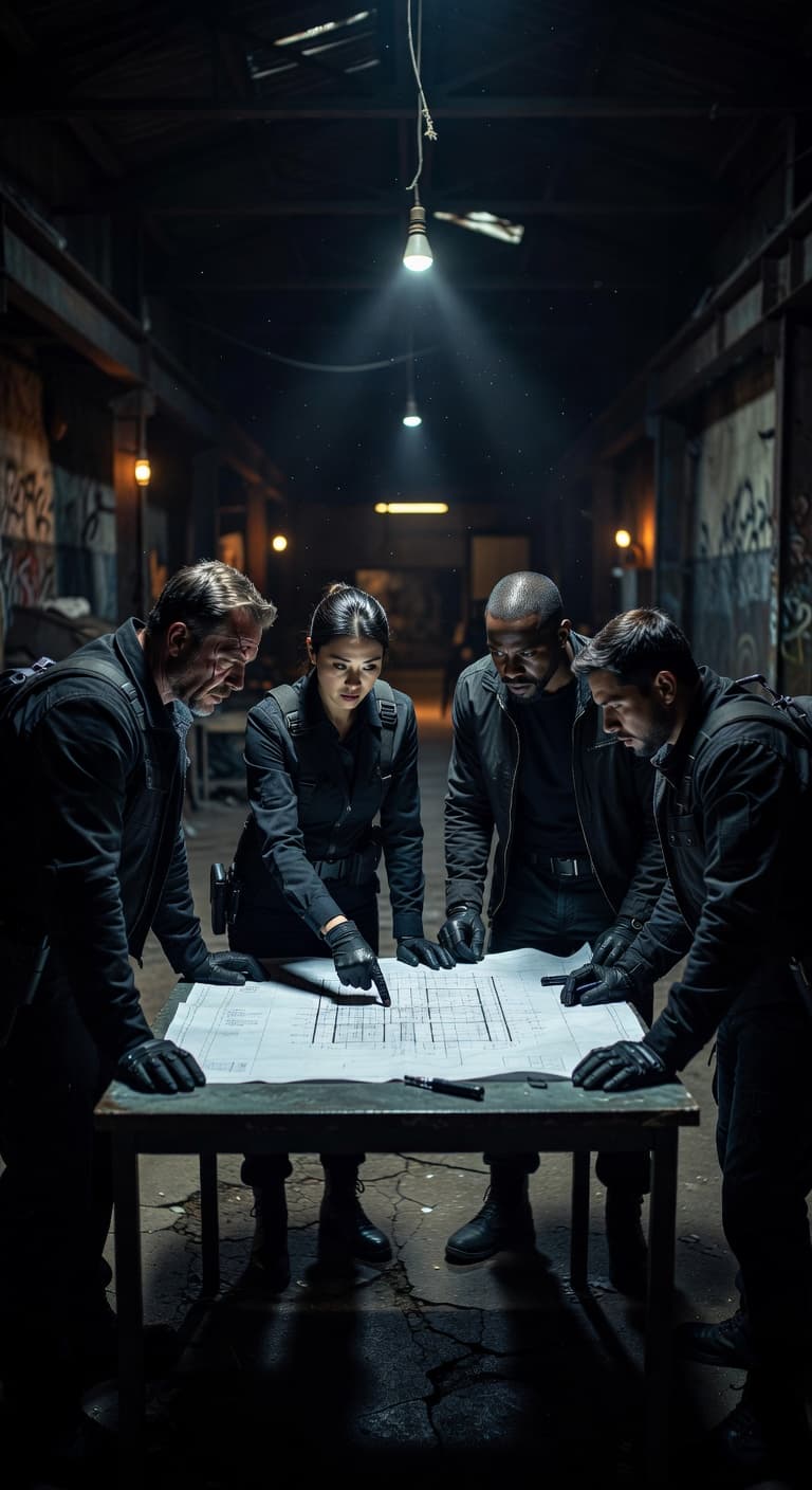 A team of operatives huddles under a stark light in a gritty, industrial space. Dressed in black, they pore over a bl...
