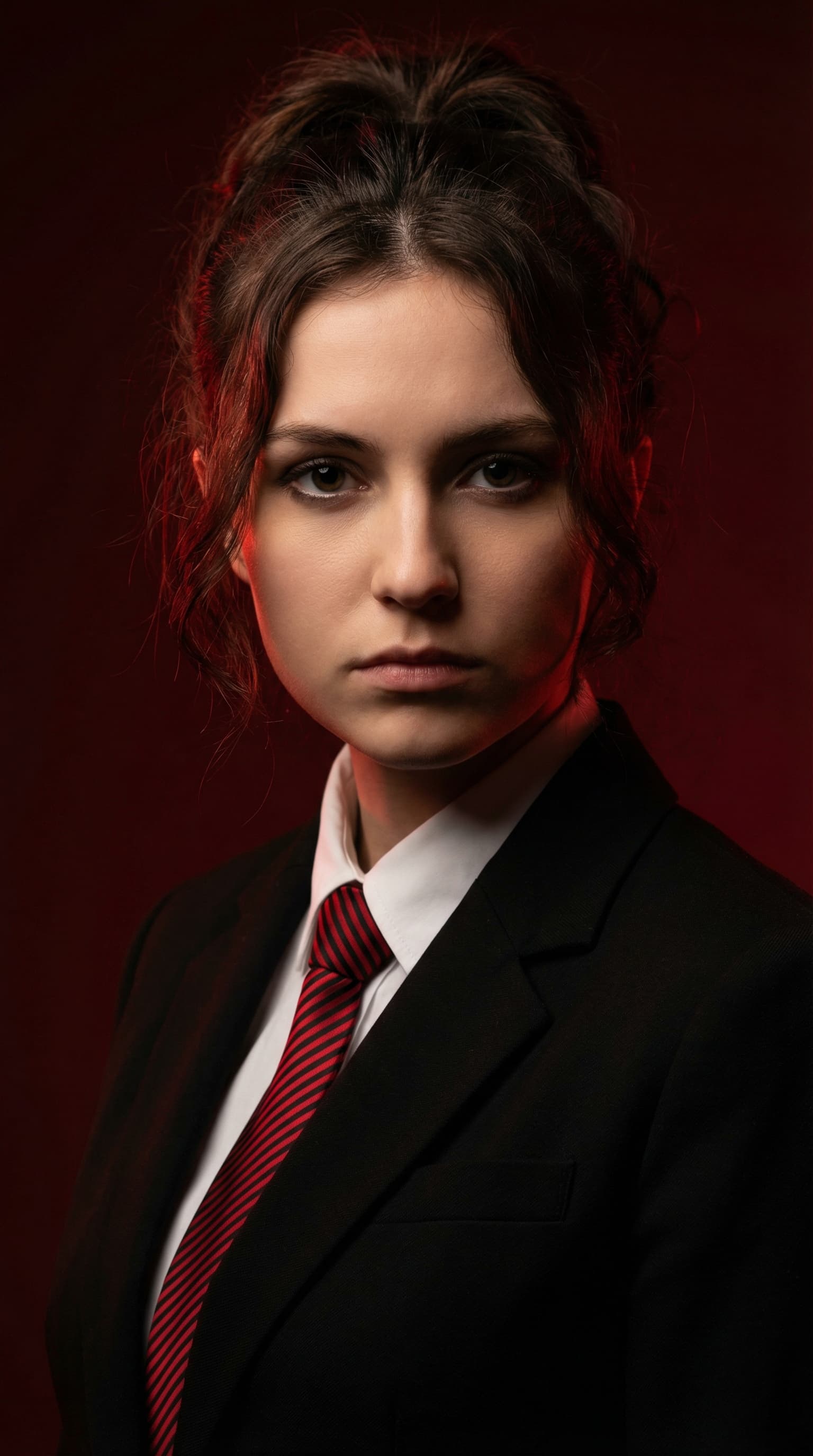A portrait of a young woman in a suit against a dark red background. She gazes directly at the viewer with a serious ...