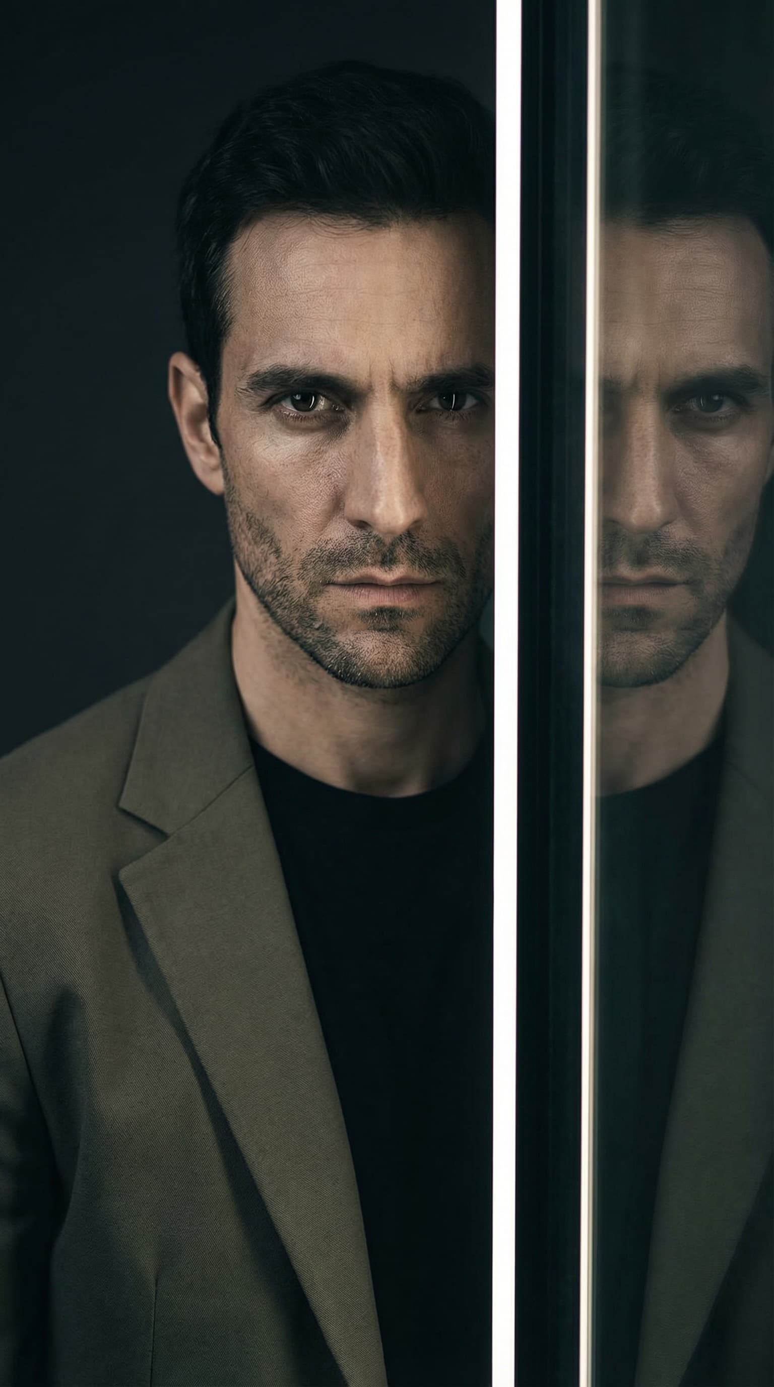 A man in a blazer stands against a dark background, bisected by a vertical strip of light that reflects his image. Th...