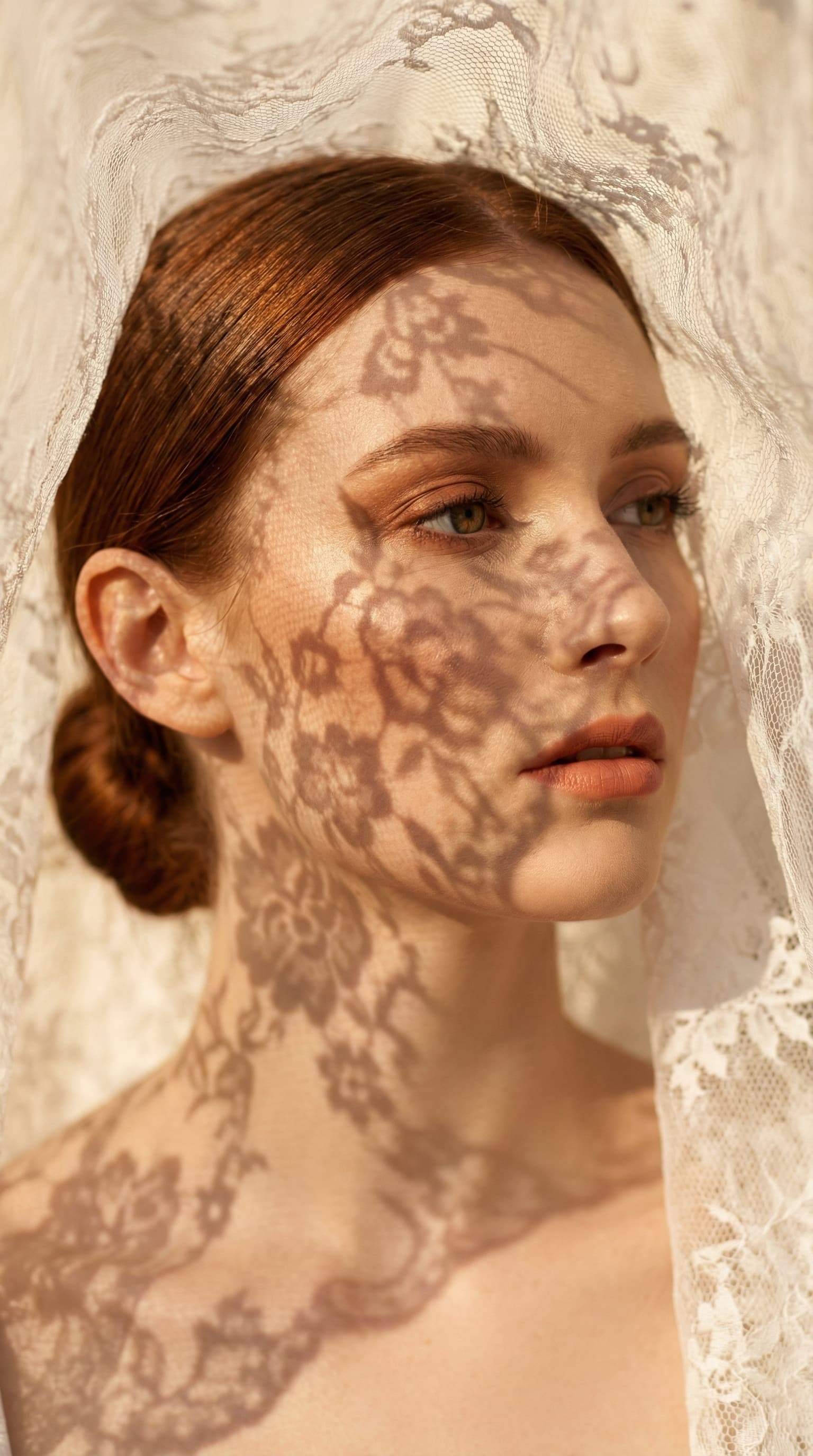 A portrait of a woman veiled in delicate white lace is bathed in soft, warm light. Floral shadows dance across her fa...