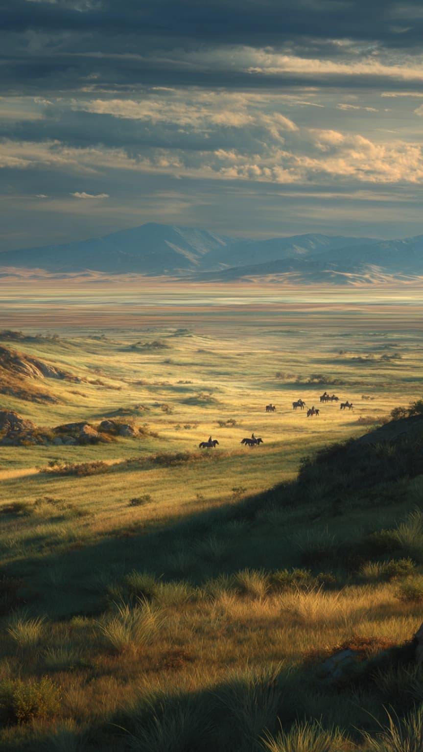 A sweeping landscape of a grassland realm, with a centaur herd grazing peacefull...