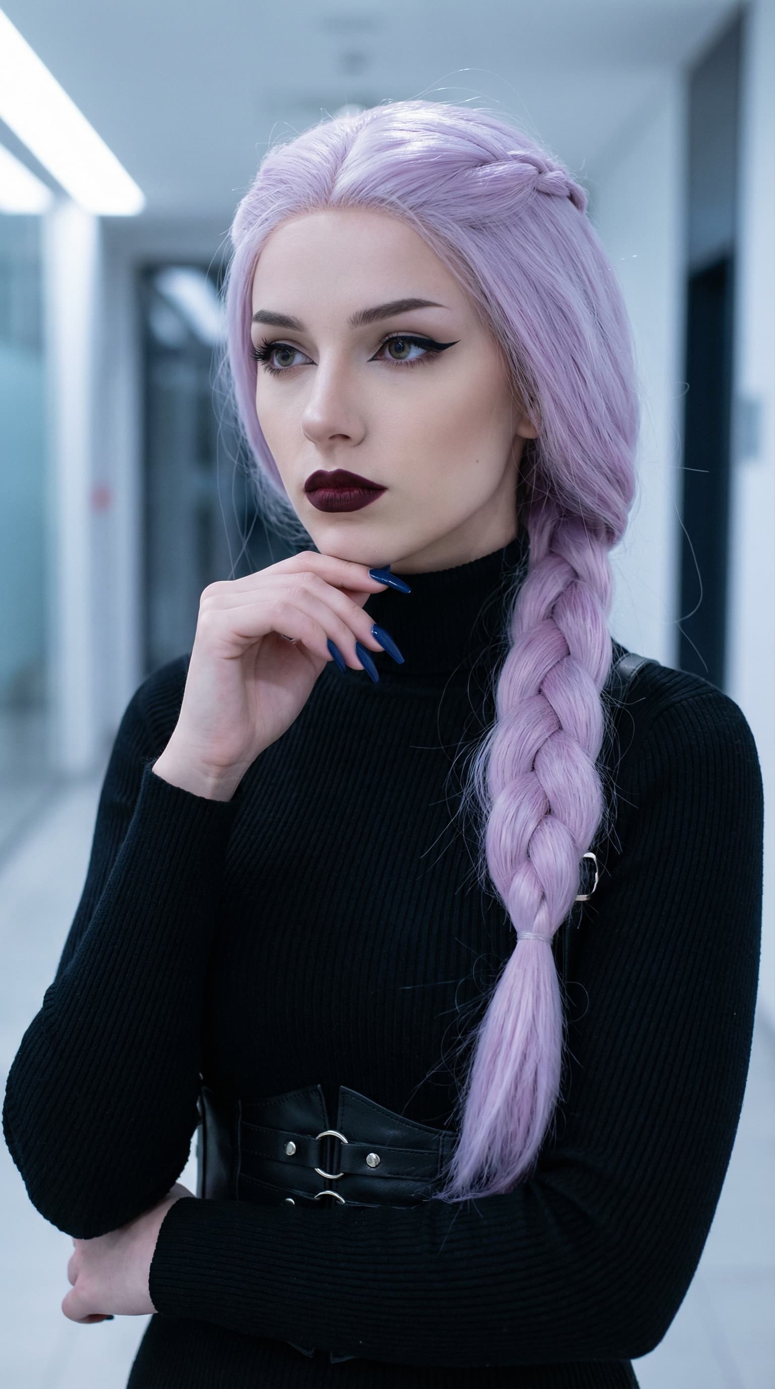 A young woman with lavender hair and dark makeup poses in a stark hallway. Her serious expression and gothic-inspired...