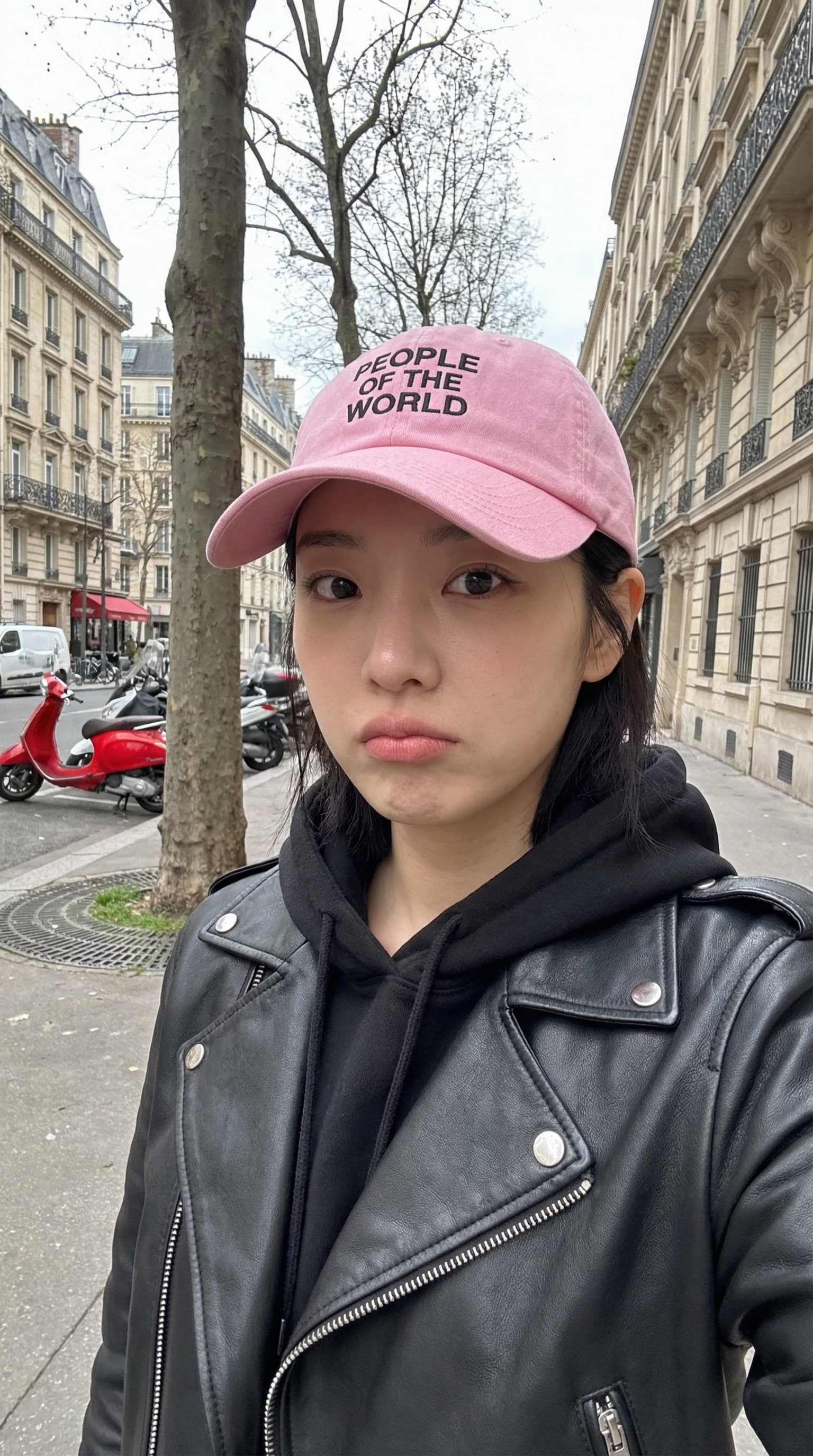 A young woman in a pink hat and leather jacket stands on a Parisian street, facing the viewer with a slightly melanch...