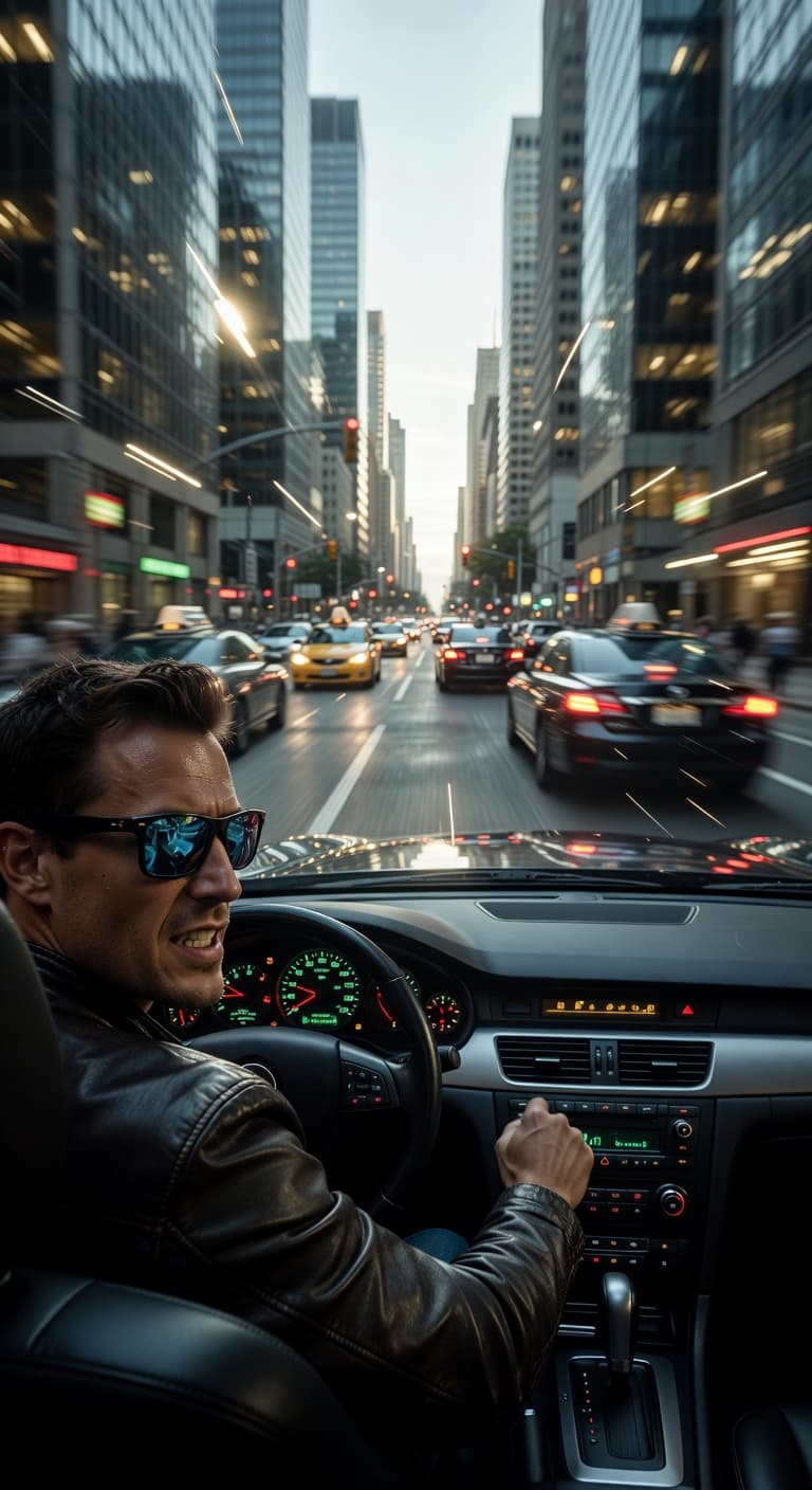 A man in sunglasses drives through a bustling city street, seemingly impatient with the surrounding traffic. The comp...