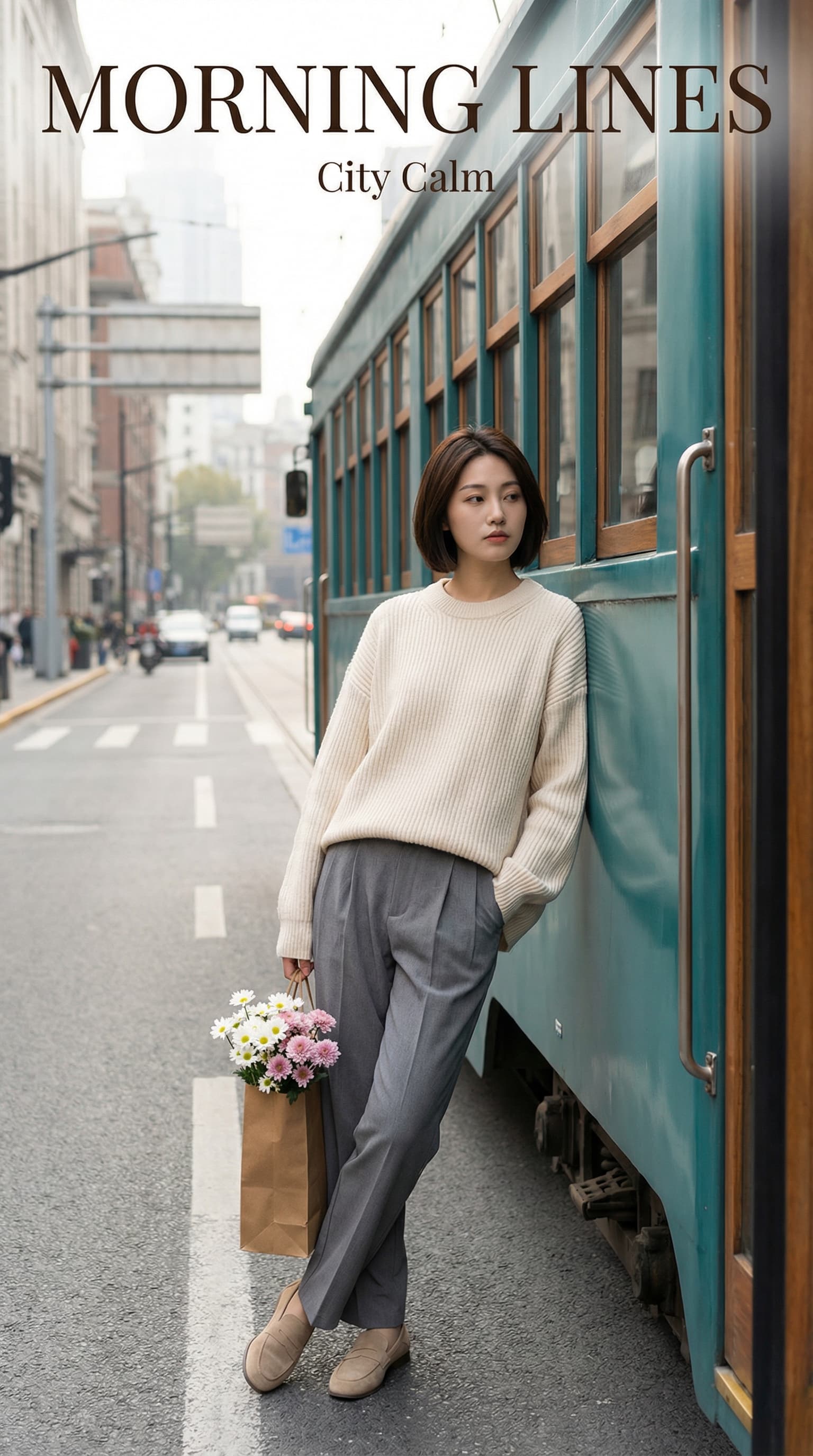 A woman stands calmly against a vintage train car on a city street, holding a paper bag of flowers. The image has a s...