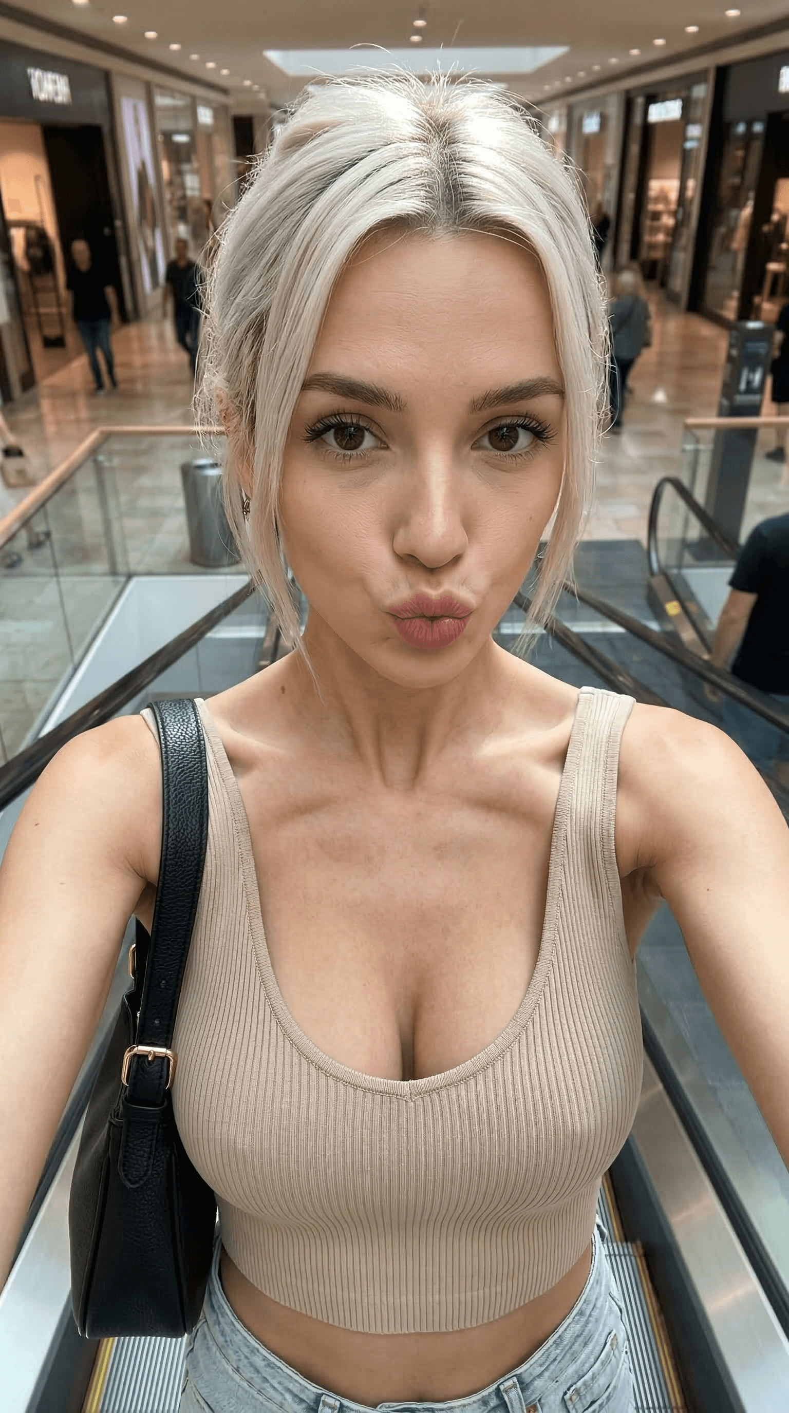 This image captures a woman with platinum blonde hair taking a selfie in a bright, modern shopping mall. The informal...