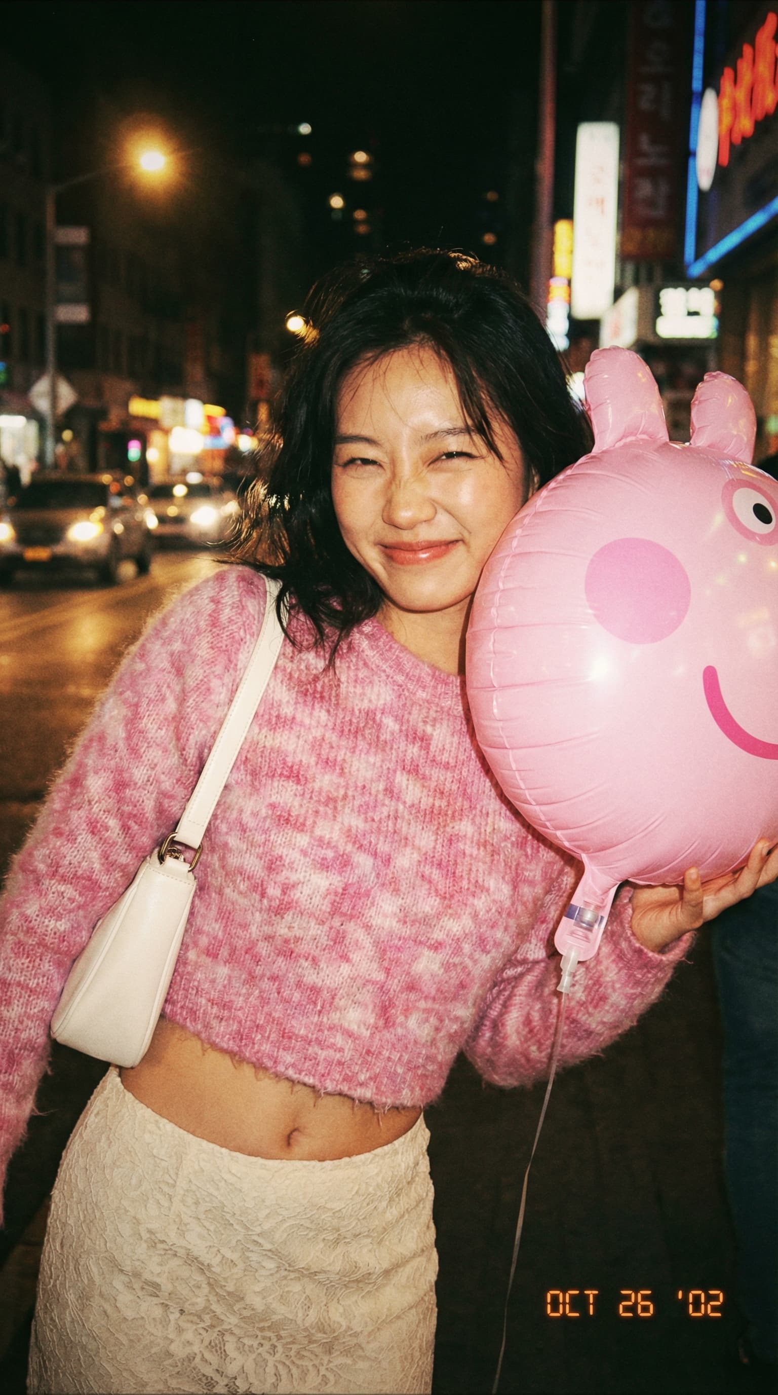 Captured in a nostalgic film style, this image depicts a smiling woman holding a pink Peppa Pig balloon against the b...