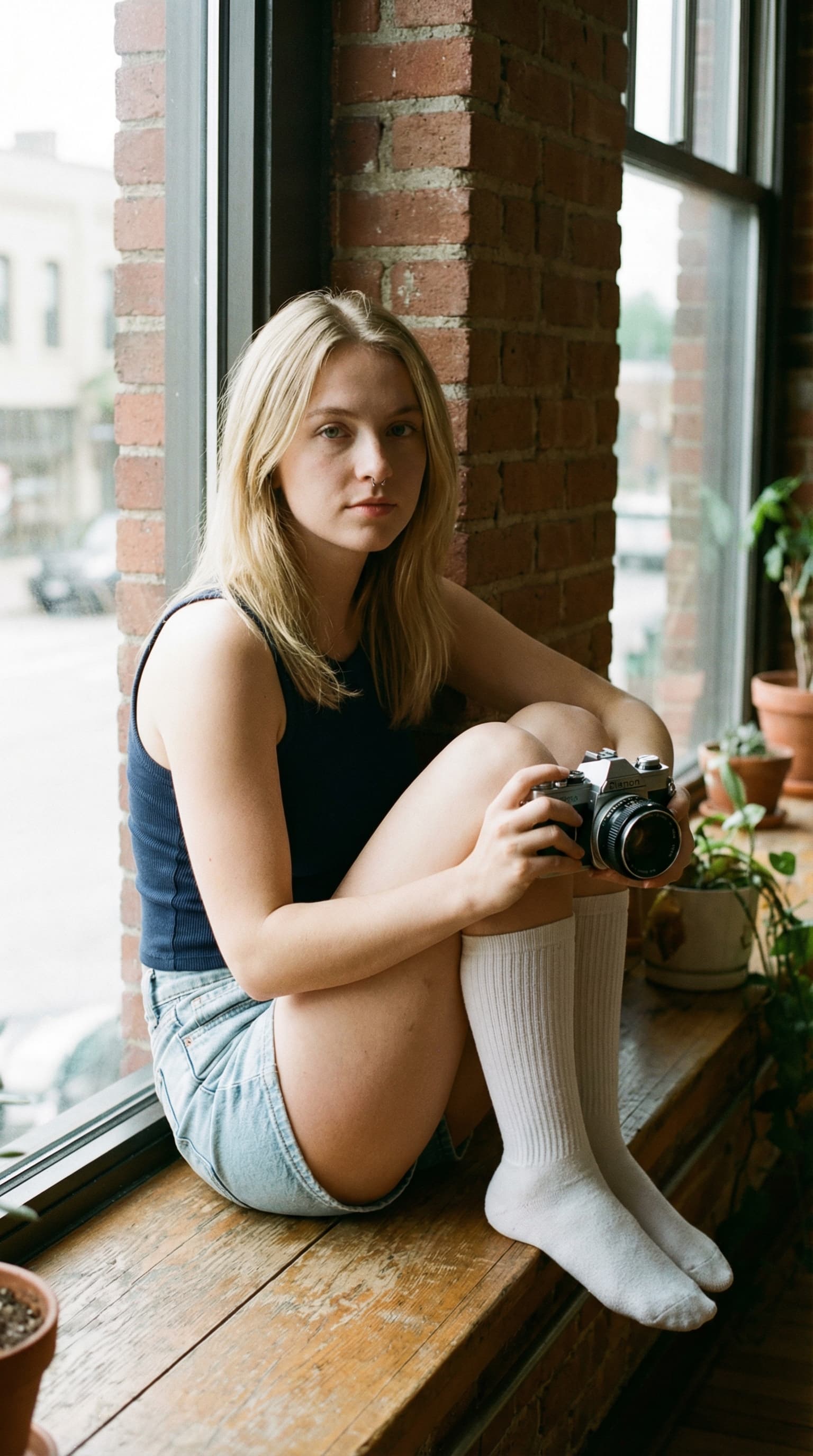 Captured in soft, natural light, a young woman sits in a window holding a vintage camera. Brick walls and potted plan...