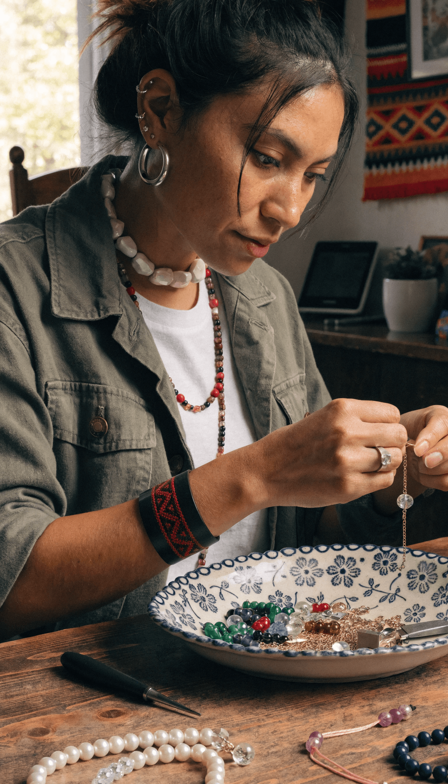 In this intimate portrait, a woman focuses intently on crafting jewelry in a sunlit domestic setting. The image captu...