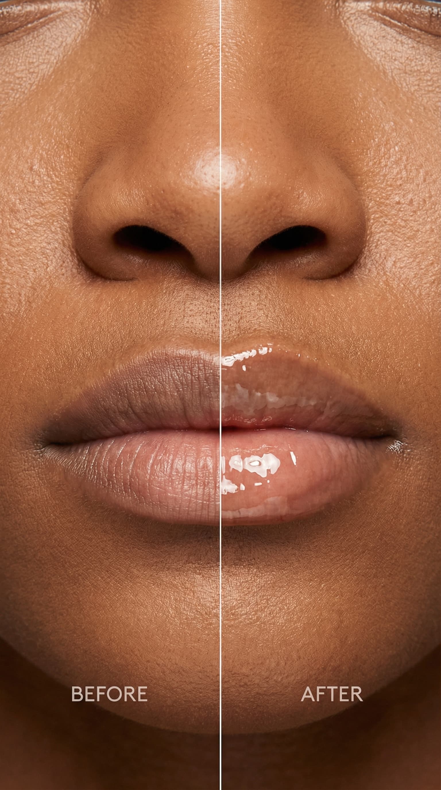 This close-up study in contrasts presents a human face bisected, exploring the transformative power of cosmetic enhan...