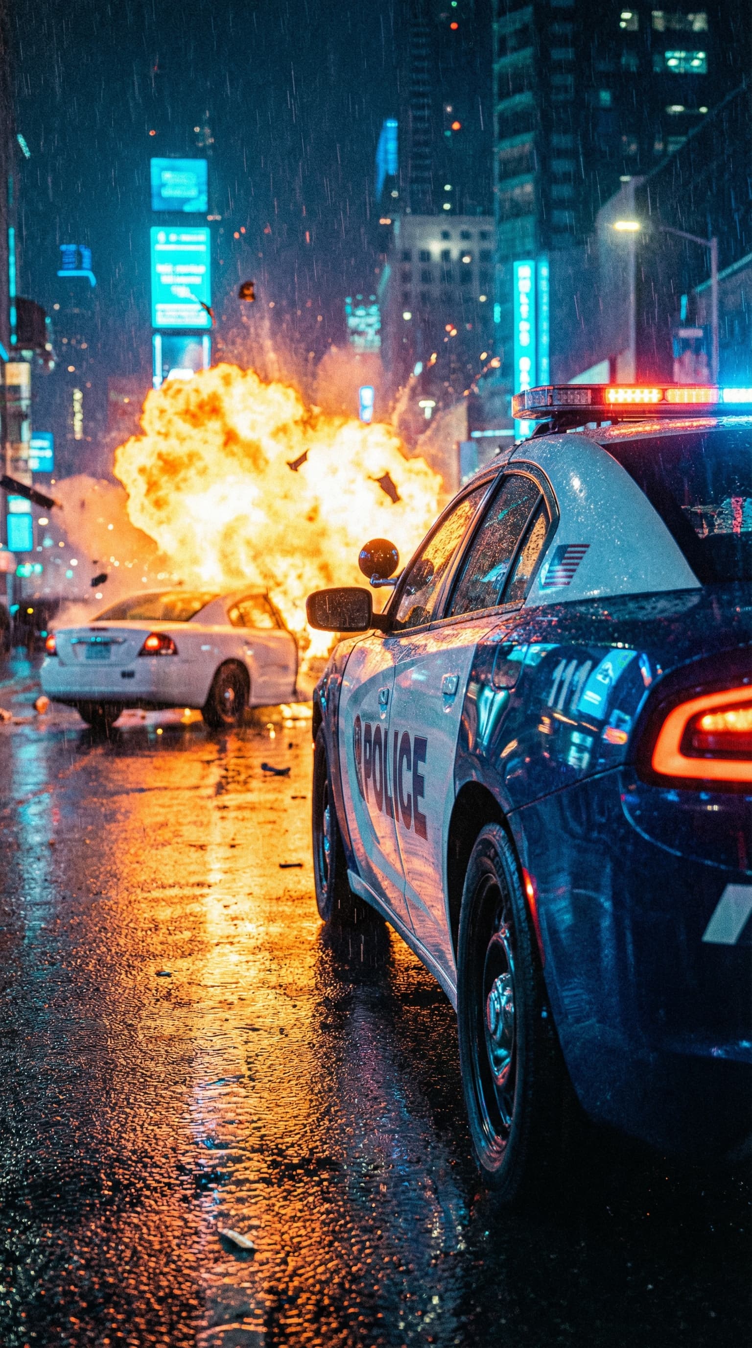 In the midst of a rainy cityscape, a police car stands in the foreground as an explosion erupts in the distance. The ...