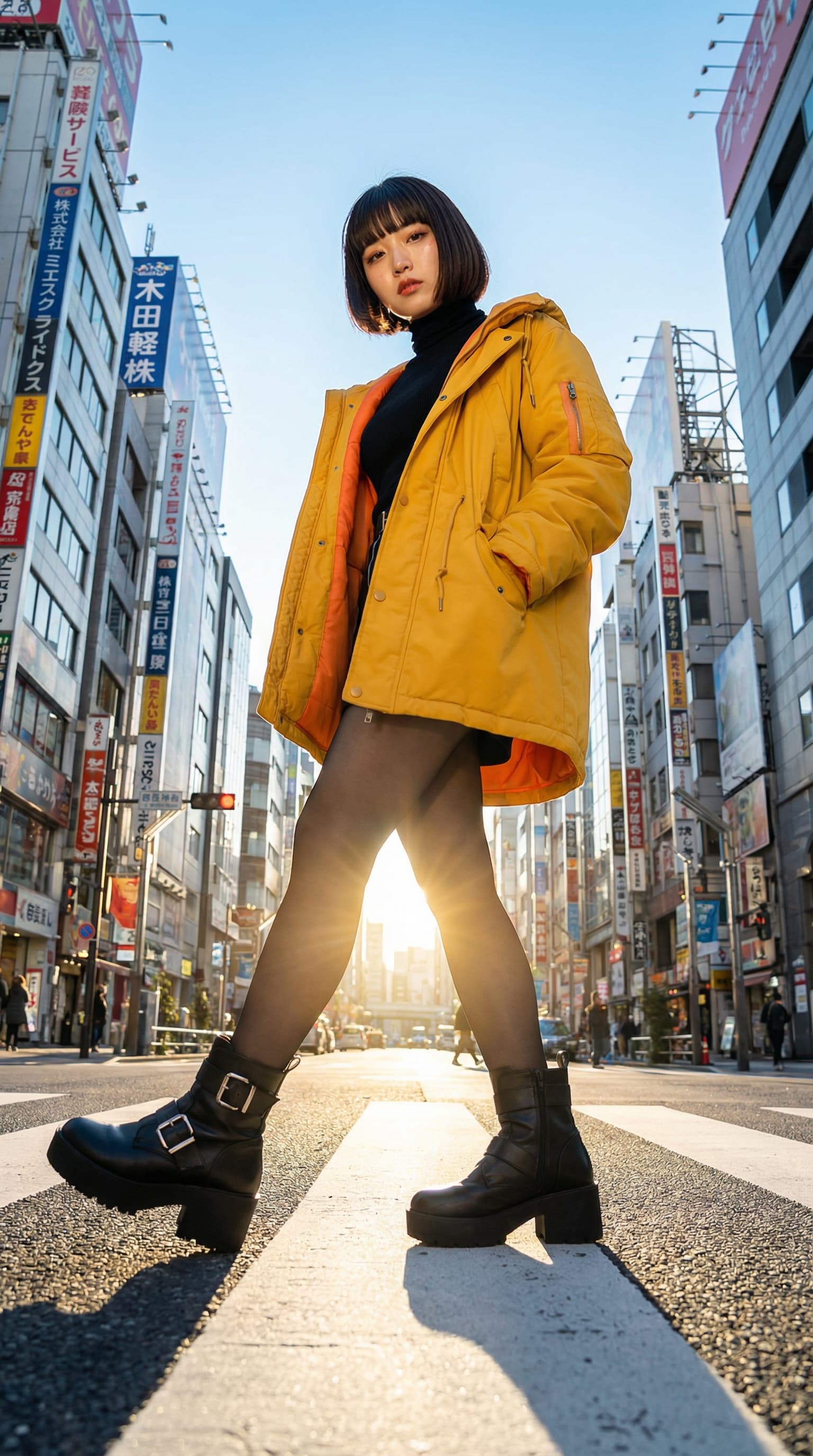 A stylish young woman in a yellow parka confidently strides across a crosswalk in a bustling Asian city. Shot from a ...