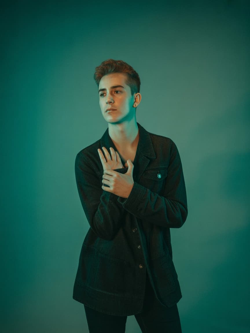 A young person in a denim jacket stands pensively against an ambiguous backdrop illuminated by cool green light. The ...