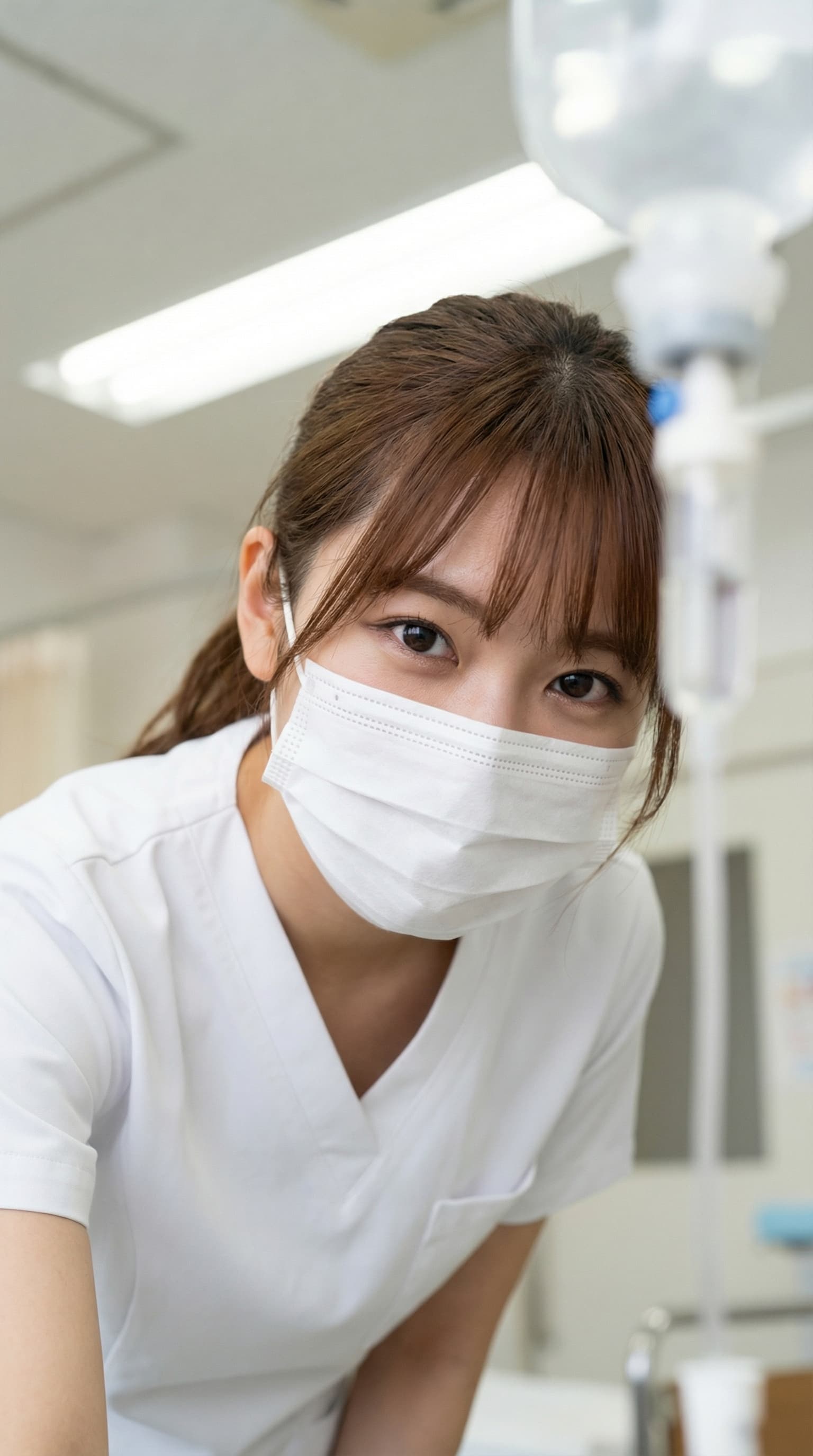 A medical professional in a surgical mask looks intently at the viewer. An IV drip hangs in the background, suggestin...