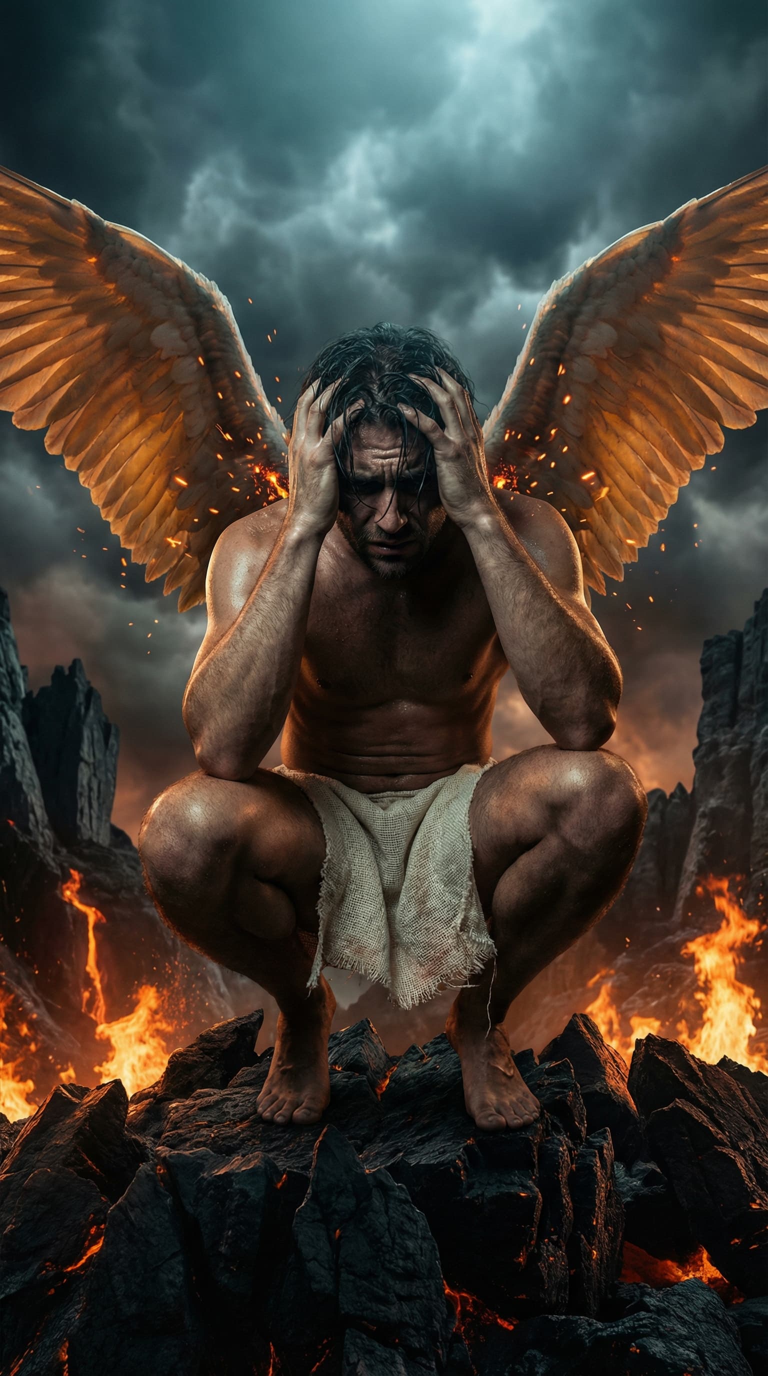 This image portrays a fallen angel in anguish, kneeling atop volcanic rocks amidst a fiery landscape. The dramatic li...
