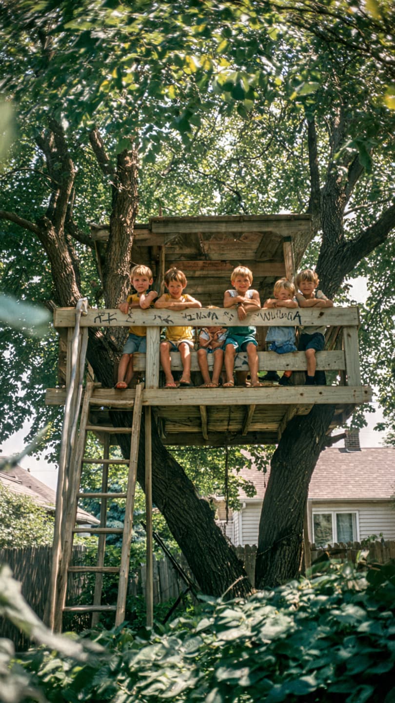 Five children in a treehouse. Laughter and adventure. Hand-drawn flag. Suburban ...
