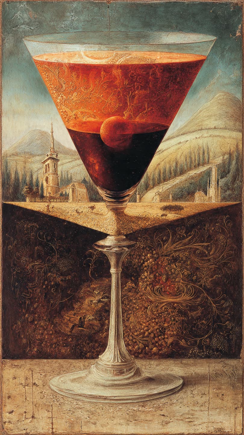 A glass of vintage cocktail created by Remedios Varo, ancient-feeling artwork th...