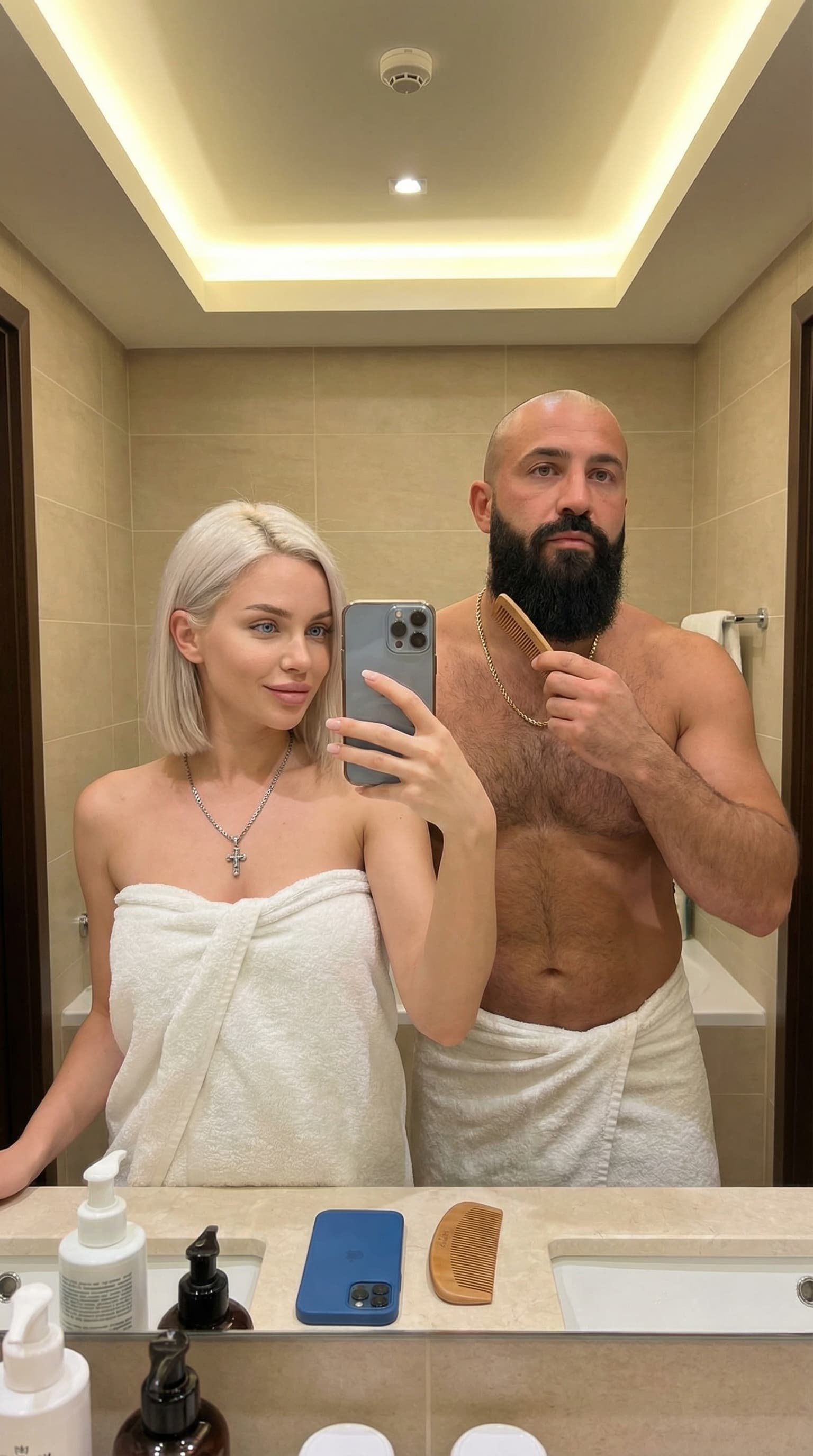 Captured in a hotel bathroom, a blonde woman and a bearded man wrapped in towels take a selfie. The image possesses a...