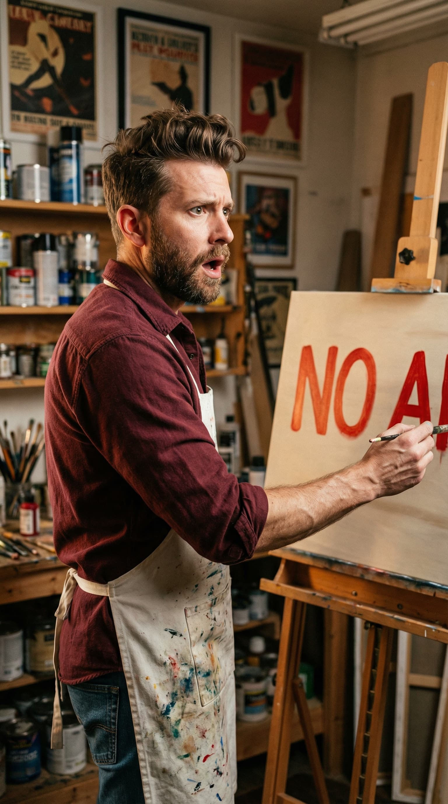 An artist in a paint-splattered apron stands in a cluttered studio, brush in hand, looking thoughtfully at a canvas. ...