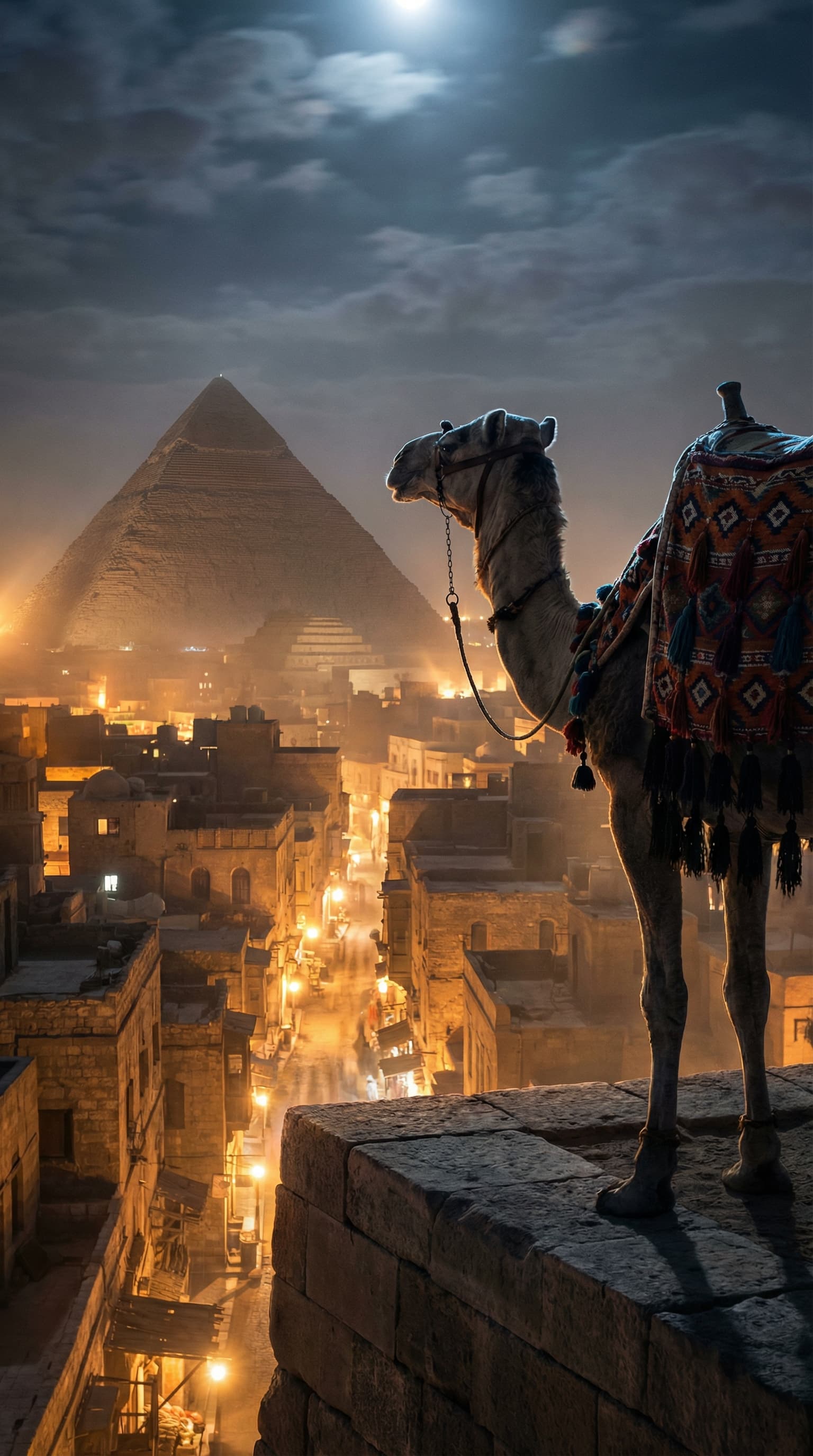 A camel stands poised on a stone ledge, silhouetted against a moonlit cityscape of ancient Egypt. In the distance, th...